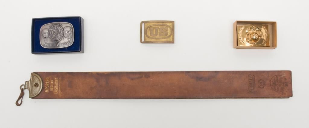 Lot of 3 belt buckles described as follows. Number 1 is a 1977 issue Smith & Wesson 125th anniversary belt buckle silver plated in blue and silver box. Number 2 is a reproduction U.S. officers buckle in style of 1870s. Number 3 is agold plated United States Marine Corps buckle dress type with two keepers in excellent condition. Missouri Razor Strop Company made strop constructed of Russian Loshaka and so marked. Loshaka is some sort of leather we wouldassume. Est.: $100-$200