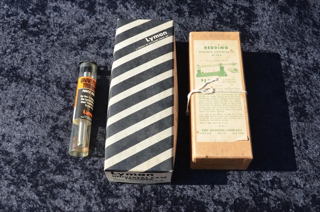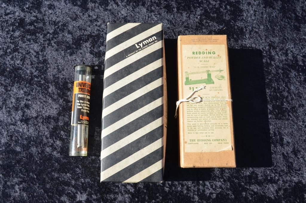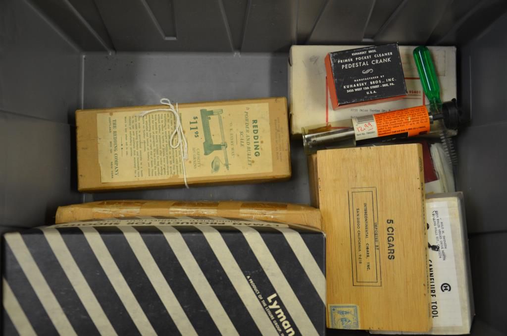 Lot of 3 boxes of reloading equipment including RCBS Rock Chucker press, Lyman case trimmer, etc. Est.: $125-$250.