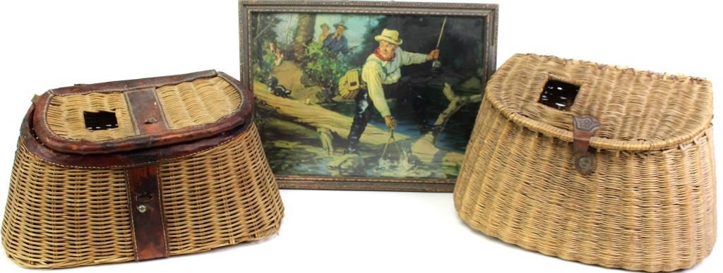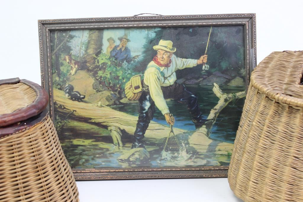 Lot of 3 cabin decor items includes 2 fishing creels and an period lithograph of a fisherman about to get skunked (the original artwork was by HY. Hinteermeister entitled Shattered Hopes). This print in its original frame, image 9 1/2" X 13".includes 2 fishing creels and an period lithograph of a fisherman about to get skunked (the original artwork was by HY. Hinteermeister entitled Shattered Hopes). This print in its original frame, image 9