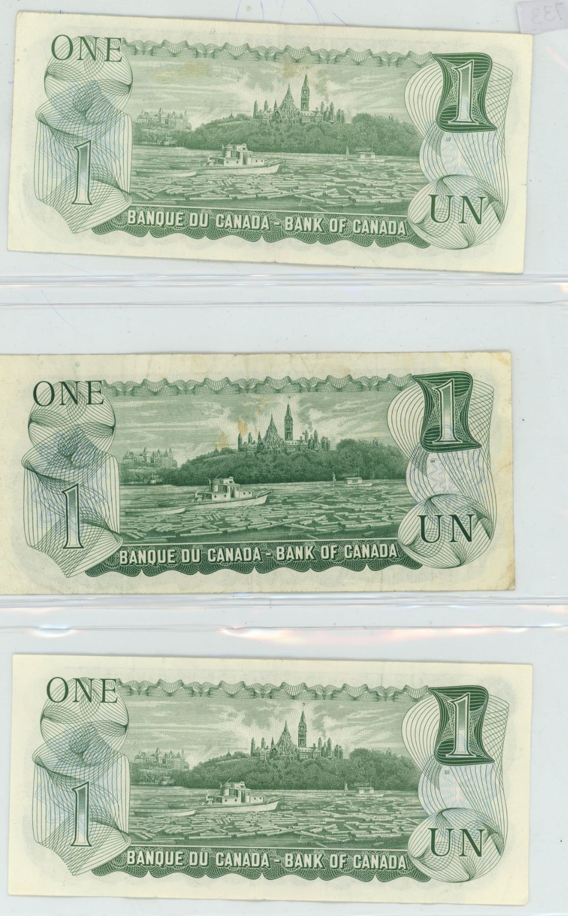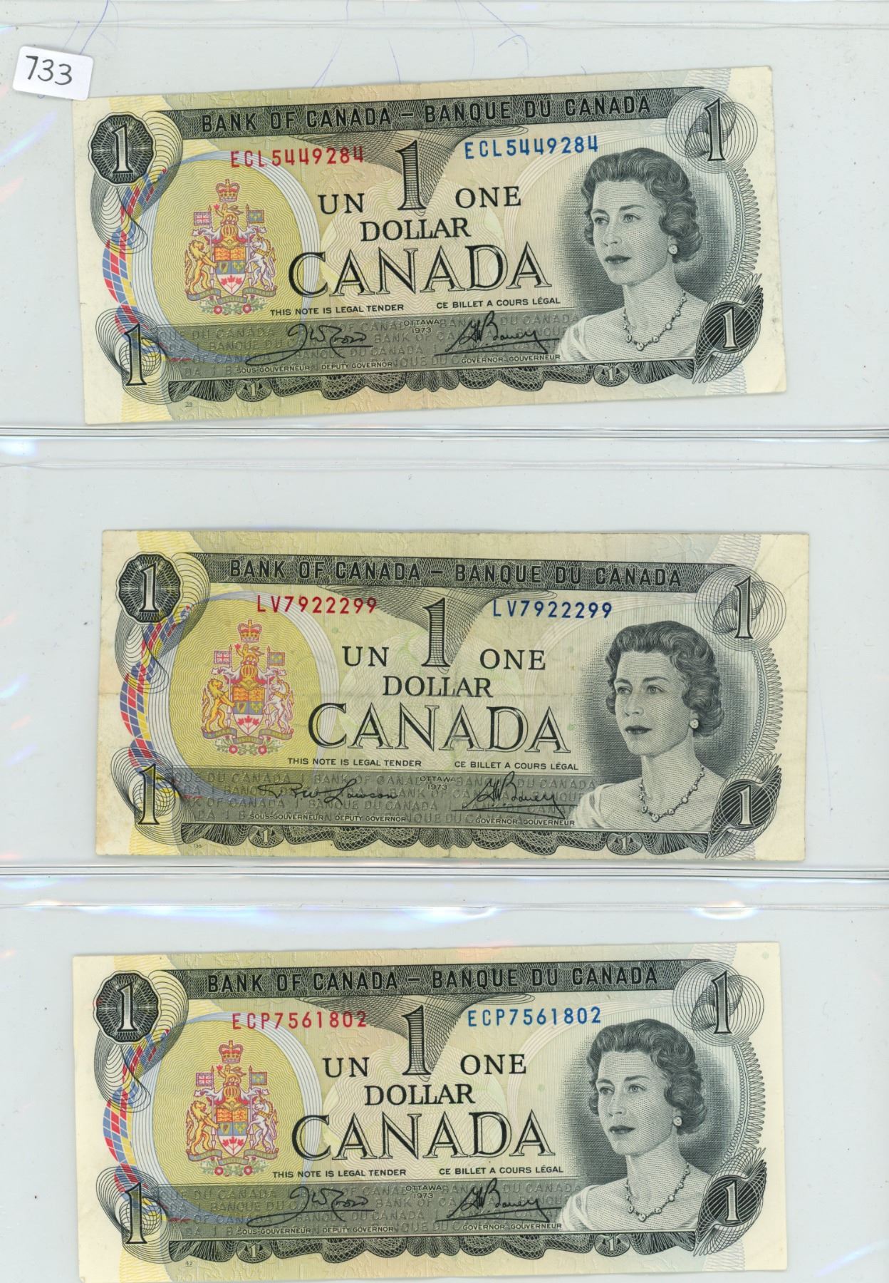 Lot of 3 canada 1973 $1 bills, Crow/Bouey (#ECP 7561802 and #ECL 5449284; Lawson/ bouey #LV 7922299
