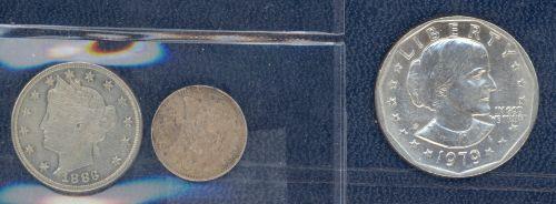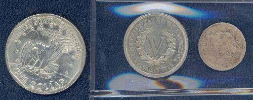 USA; 1 Dollar 1979P BU Wide Rim, Near Date, 5 Cents 1883 BU, 5 Cents 1859-O EF. Lot of 3 coins.