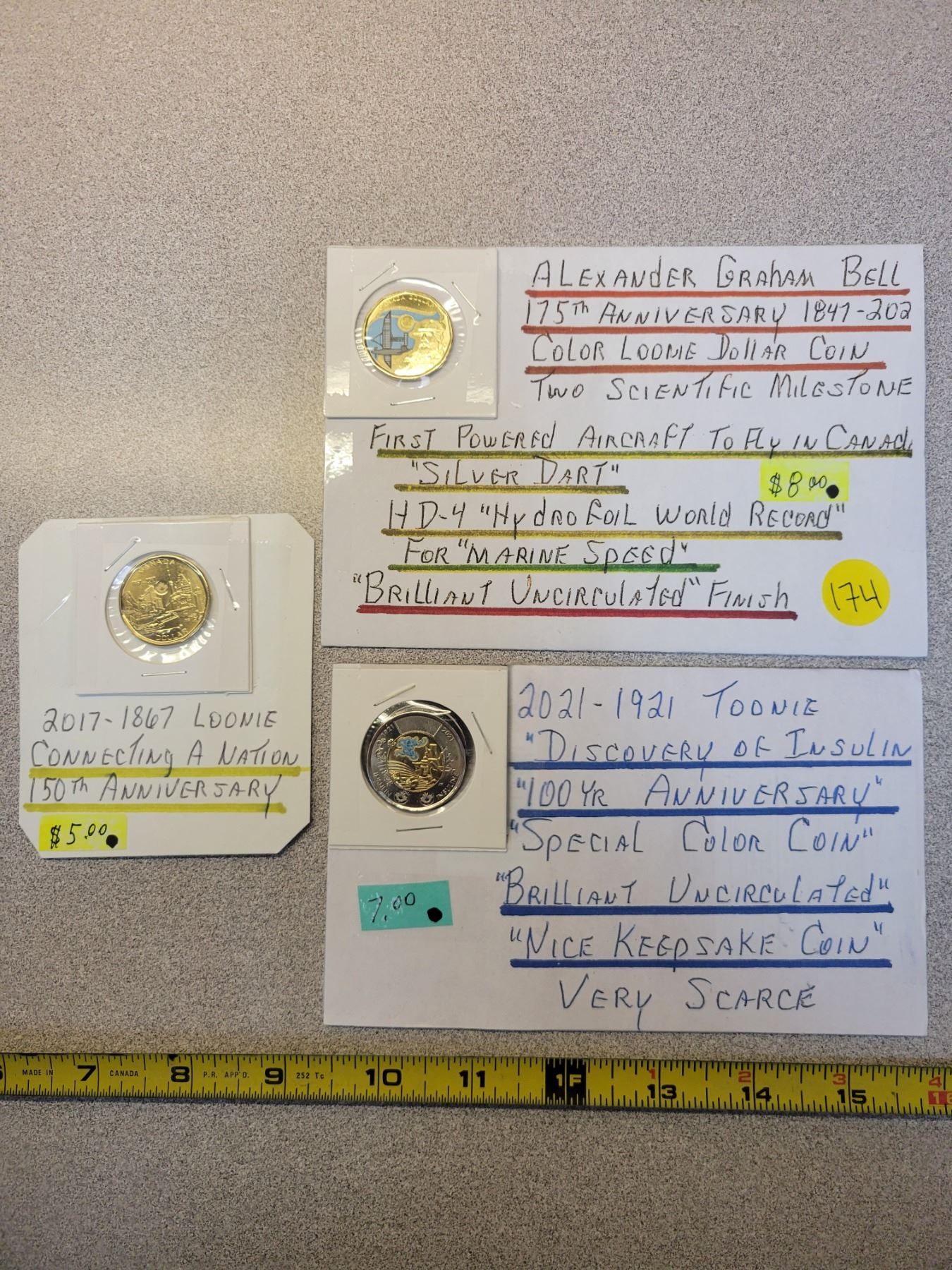 Lot of 3 collectible coins - Discovery of Insulin toonie $2.00, 175th ann. Alexander Graham Bell loonie $1.00, 1867-2017 'Connecting a Nation' 150th ann loonie $1.00