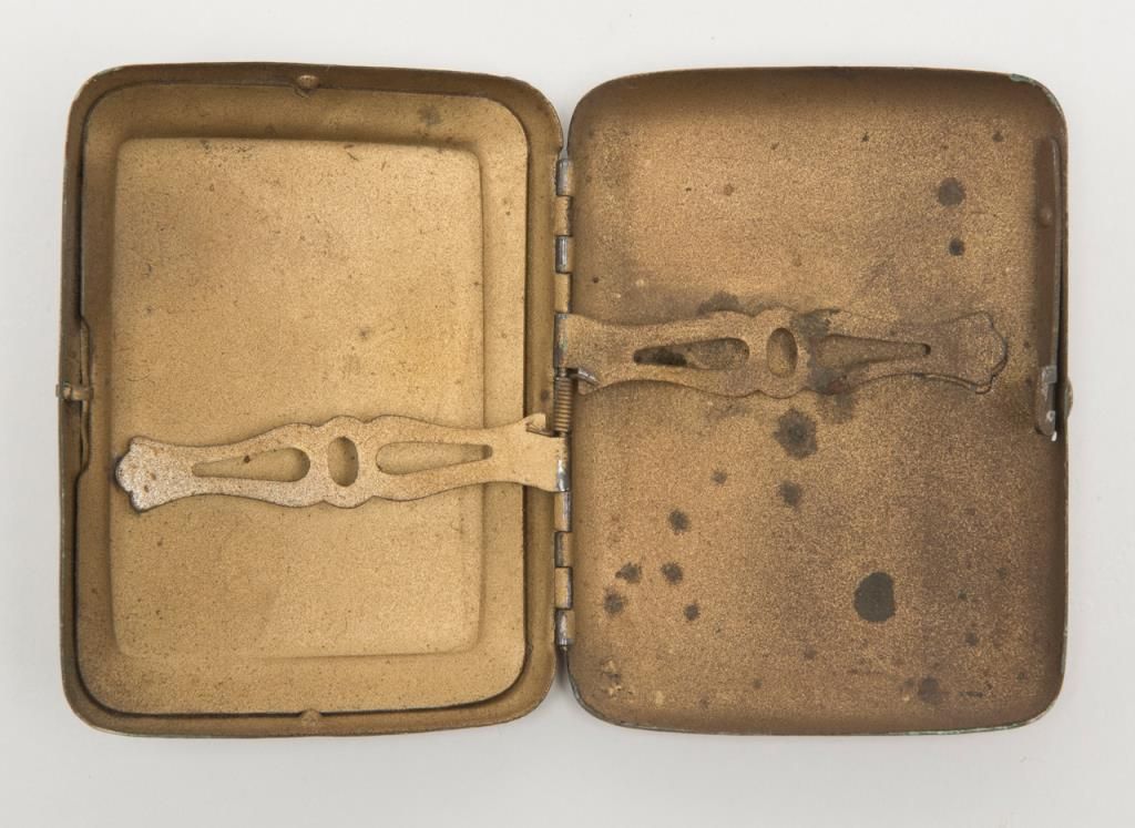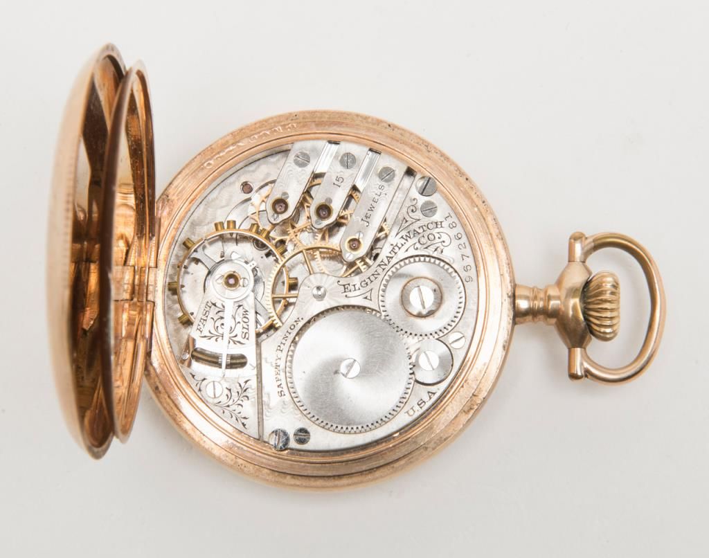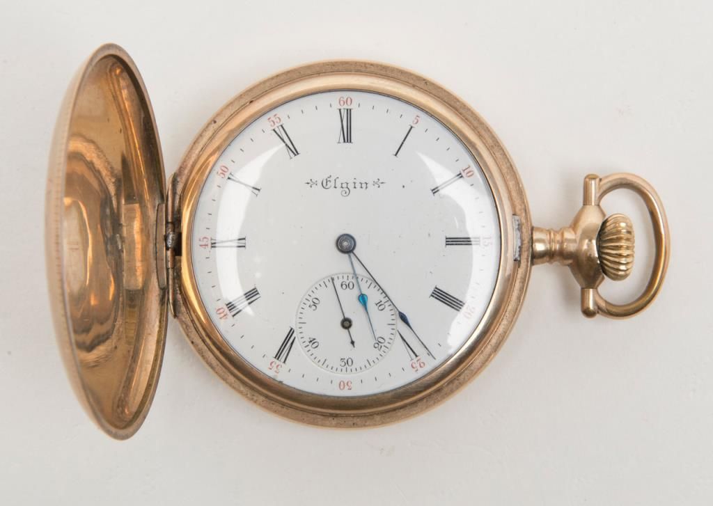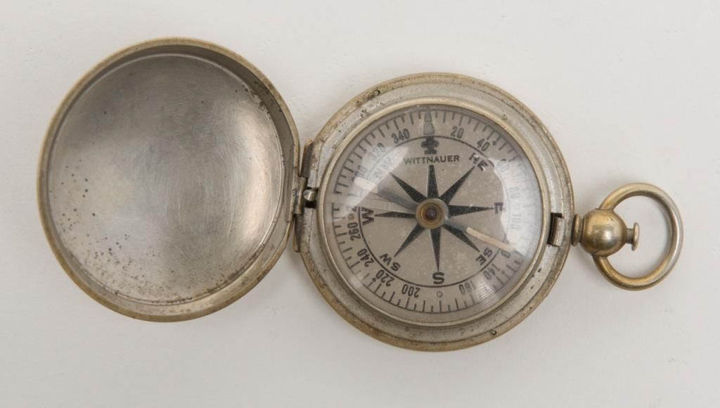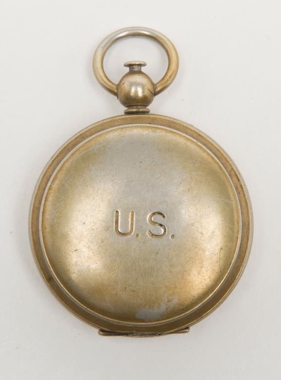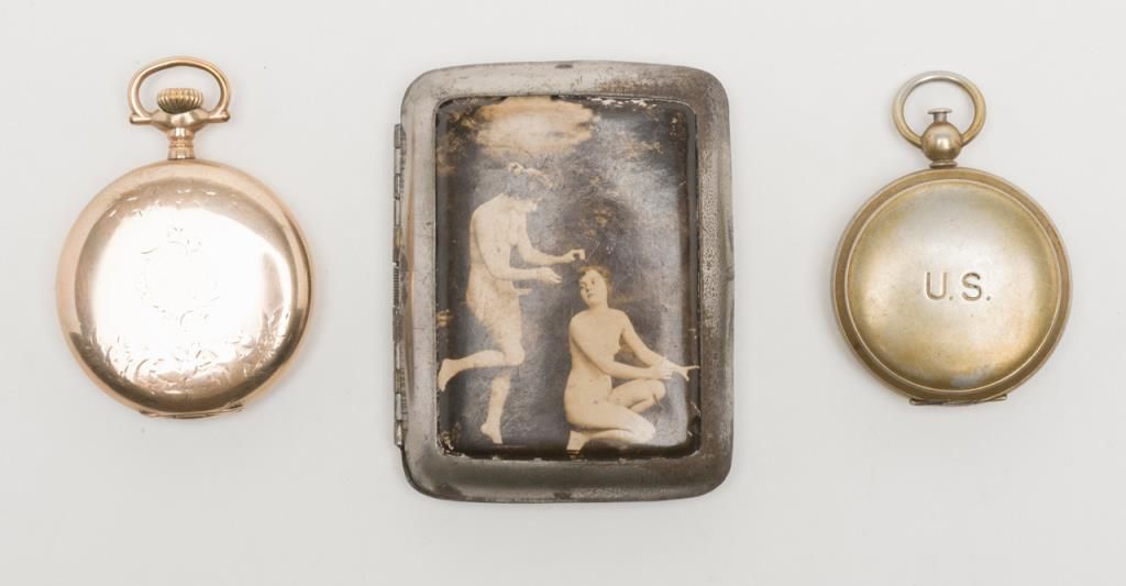 Lot of 3 collectibles including an erotic cigarette case, a U.S. marked compass and an Elgin 15 jewel pocket watch, not working at time of description. From the estate of Joe Kiser. Est.: $200-$400.