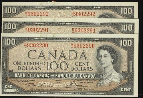 Lot of 3 consecutive 1954 $100 notes. BC-43c Lawson-Bouey B/J9302290 to 2292. All choice uncirculated.