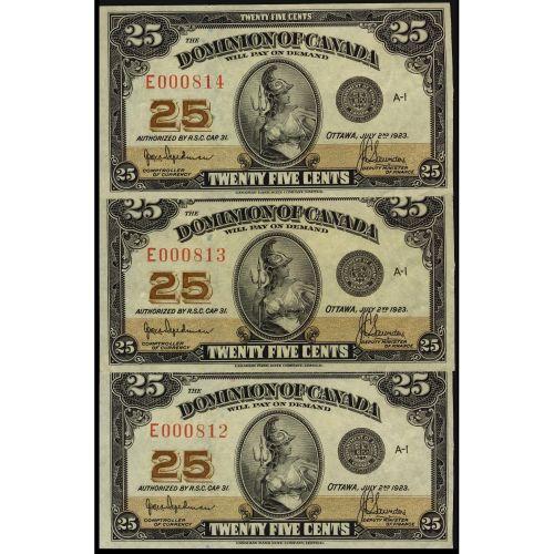 Lot of 3 consecutive LOW numbered shinplasters. DC-24a 1923 25¢ "Authorized" Hyndman-Saunders #E000812-000813-000814 Grades vary from AU-55 to Choice Unc. Rare