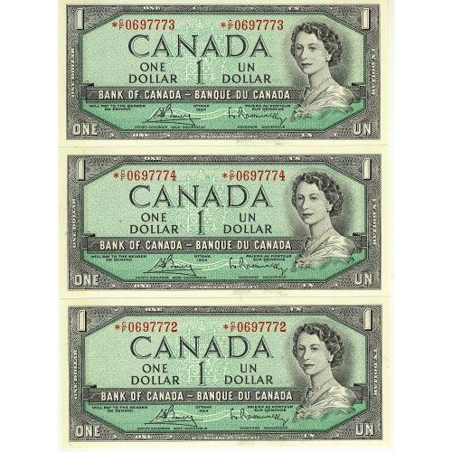 Lot of 3 consecutive numbered notes; BC-37cA 1954 $1 Bouey-Rasminski *C/F0697772 to 774. All Gem's.