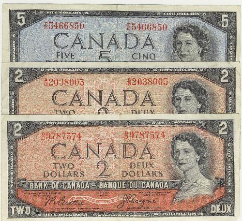 Lot of 3 devil's face notes including two 1954 $2's BC-30a (nicks) BC-30b, and the scarce 1954 $5 BC-31b prefix I/C. Grades vary from F+ to VF+.