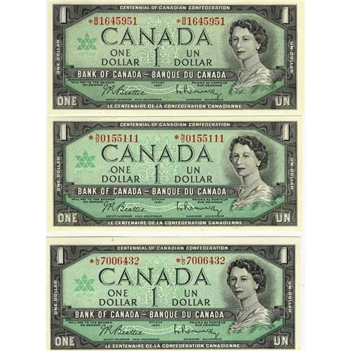Lot of 3 different 1967 $1 "REPLACEMENT" notes; *B/M, *N/O, *L/O. Grades vary from AU-55 to Gem Unc.