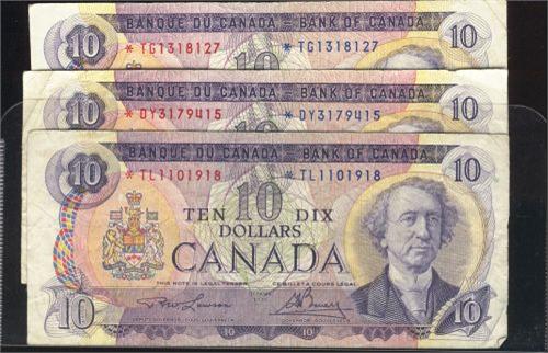 Lot of 3 different replacement 1971 $10 Lawson-Bouey notes. BC-49cA *TG, *TL,*DY. Average grade Fin