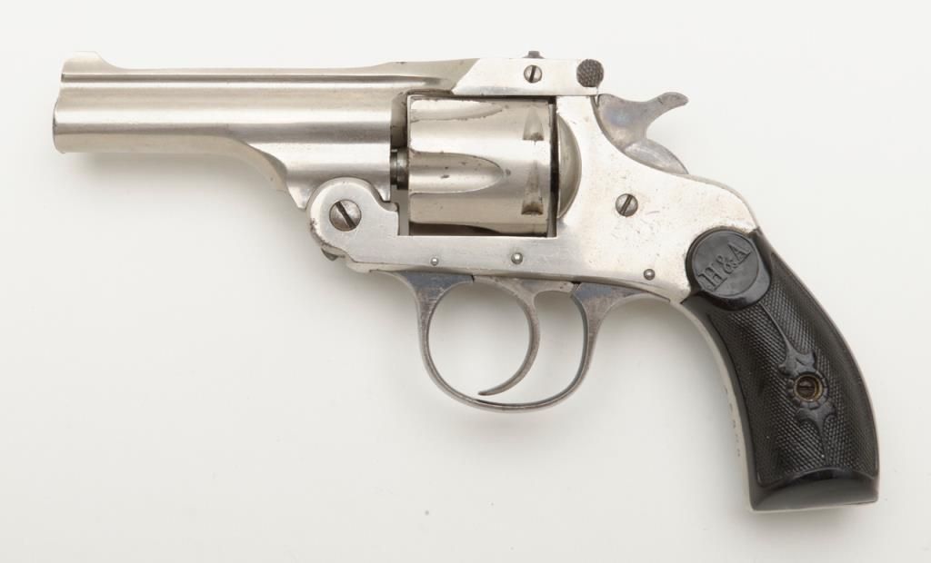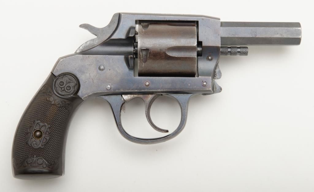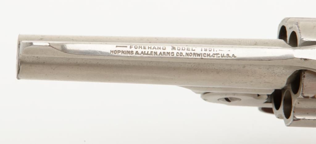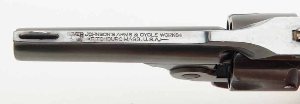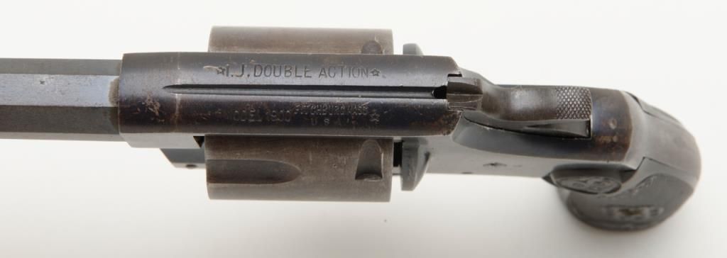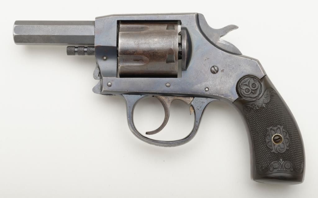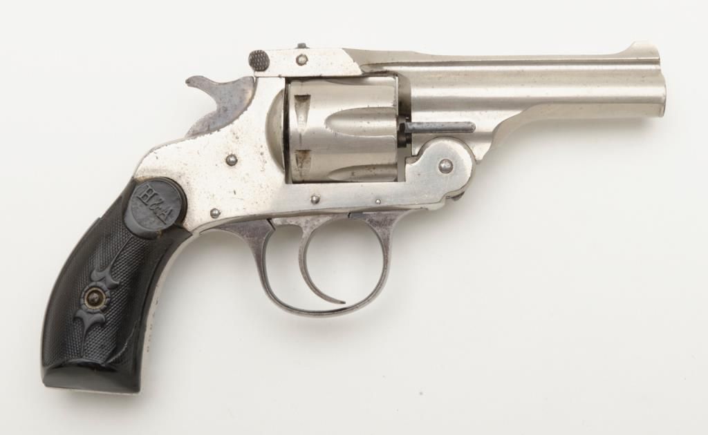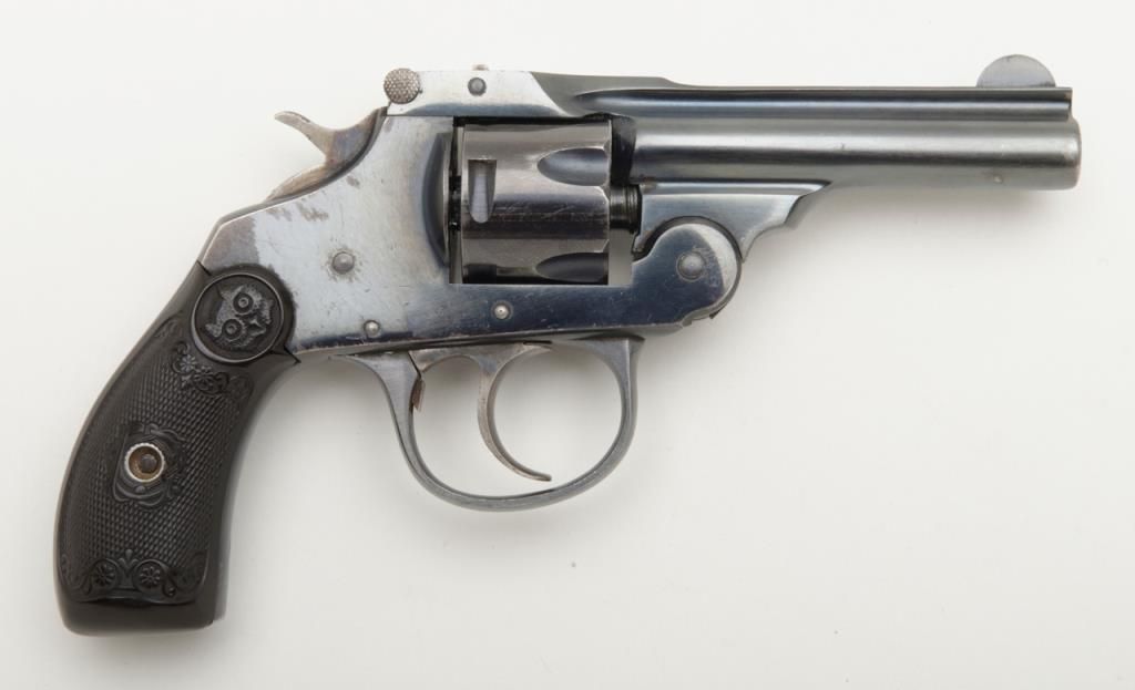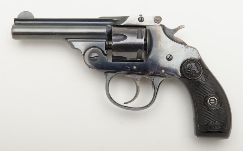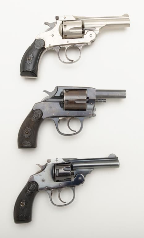 Lot of 3 double action turn-of-the-century revolvers. Number 1 is an Iver Johnson .32 S&W caliber, double action revolver with owls head grips, serial number 34863. 90% to 95% bright original blue with case hardening on the hammer and lever and near excellent grips. The interior is pristine. A strong 80%. Number 2 is a Hopkins and Allen double action .38 caliber revolver model 1901 in very good condition with most of its original nickel finish, serial number 807393. The action works but sticks. 80% to 90% nickel with wear on the grips. Number 3 is an Iver Johnson double action, 38 S&W caliber five shot revolver with owls head grips and 70% original blue. The action works well, the sight is missing and does not lock correctly. These revolvers are displayed in an old silverware box which is included. Est.: $225-$450