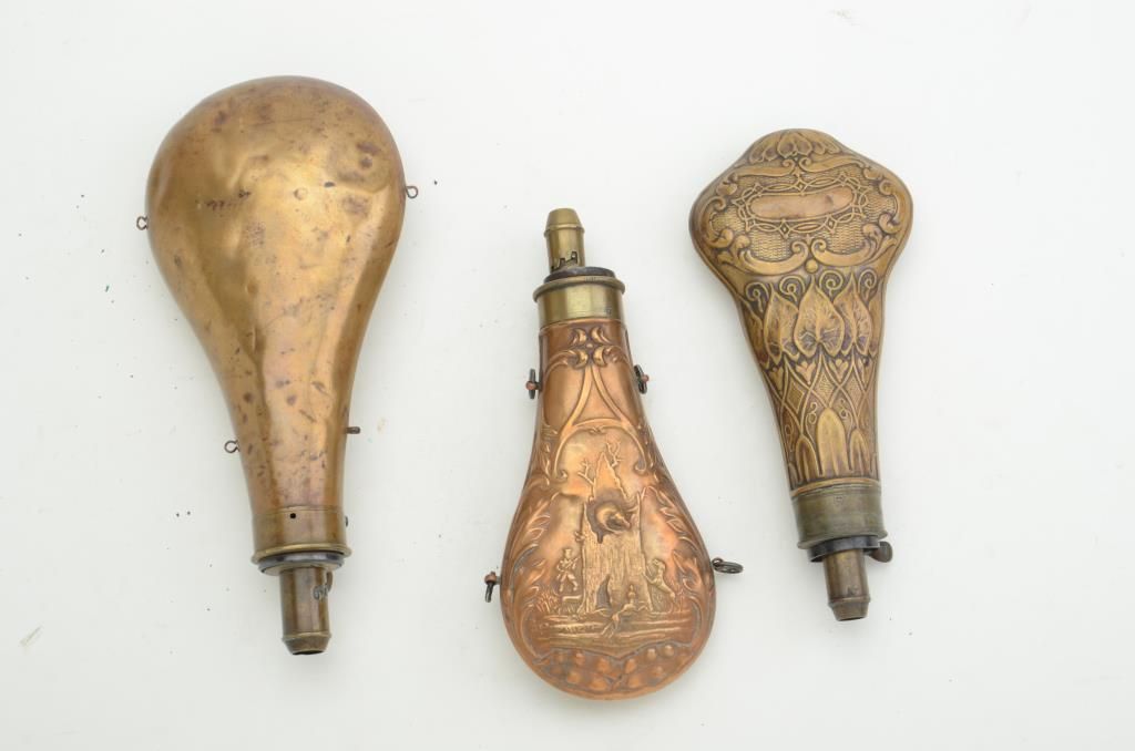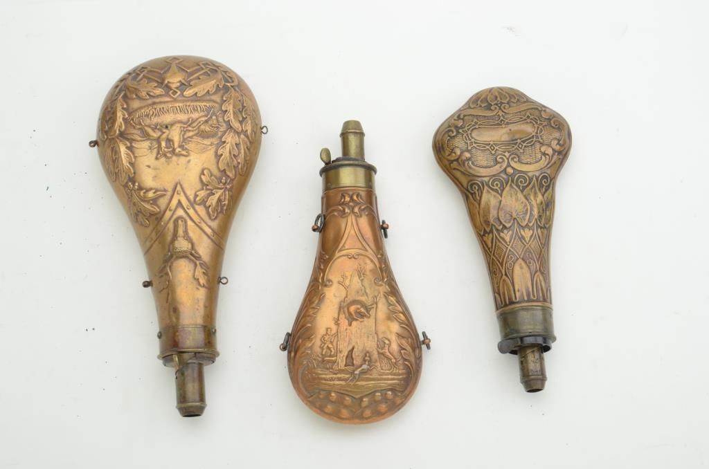 Lot of 3 high quality collector’s grade 19th century shotgun flasks; 1 Indian killing buffalo, American Cap and Flask, good condition; another shows a treed dog with hunter and the third has a leaf and scrolldesign. Est.: $400-$800.