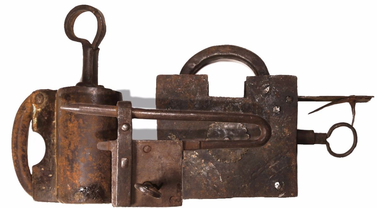 Lot of 3 iron padlocks (1 large, 1 medium and 1 small), all with keys, Spanish colonial, 1700s-1800s. 810 grams, 3 -1/2" x 6"; 603 grams, 5" x 6-1/2"; and 384 grams, 3" x 6-3/4". Early household locks for doors and chests, handmade and of different styles, original as-found condition, all recovered from an estate house in South America. With photo-certificate.