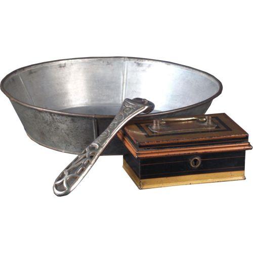 Lot of 3 items: Small Document Box w/key, Gold Pan, Stove top lift handle