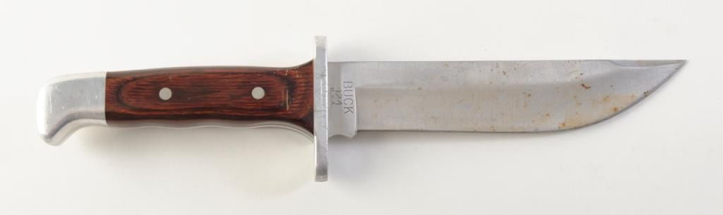 Lot of 3 large belt knives with leather sheaths including a Buck knife in very good condition, a Case knife with some sharpening and a Randall in fine condition with sharpening stone. Est.: $300-$600.