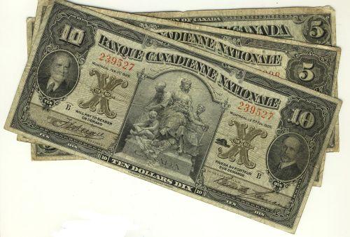 Lot of 3 large size notes. Includes Banque Canadienne Nationale 1929 $5 (85-12-02) and 1929 $10 (85-12-04) and The Royal Bank of Canada 1933 $5 (630-16-02). VG to Fine.
