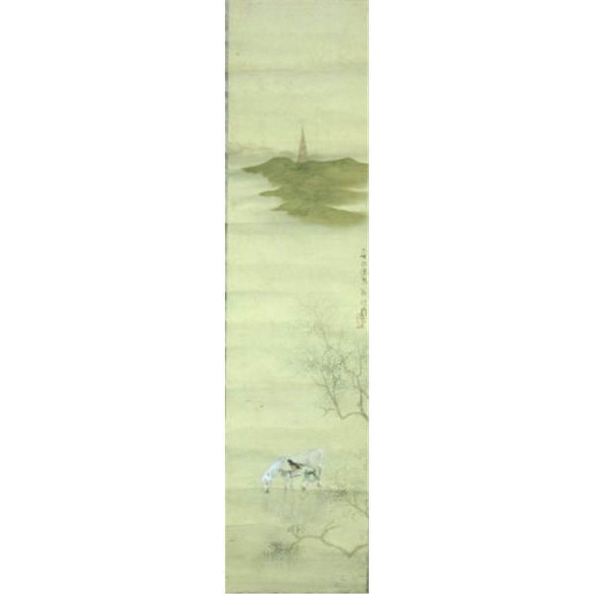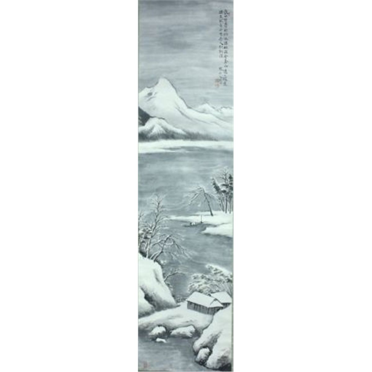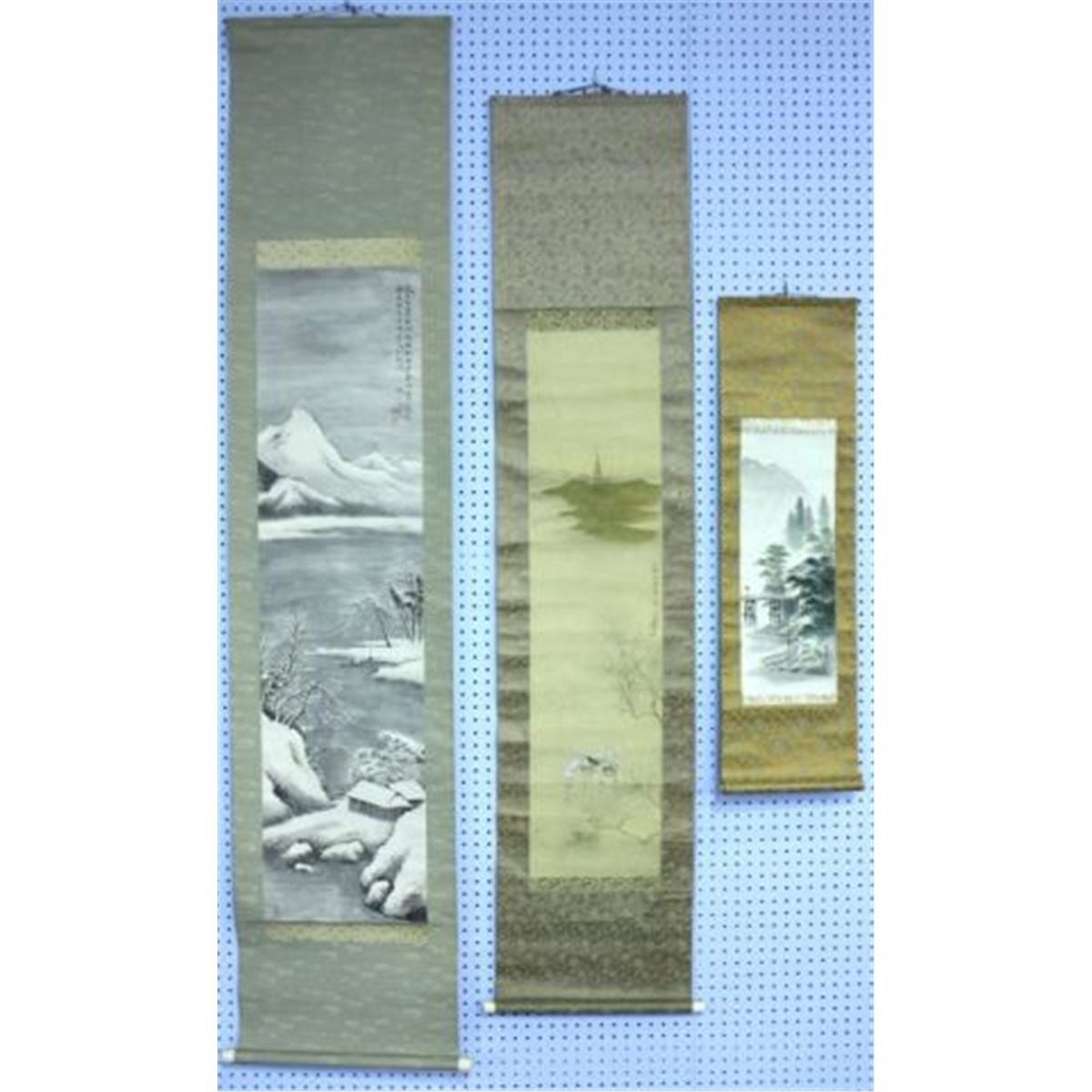 1- "Bridge with Rowboat", approx. 20.5" x 8". 1- "Winter Scene with Mountains, Lake & House", approx. 47.25" x 13". 1- "Floral" watercolor, approx. 14.5" x 17". Please read our terms of sale.