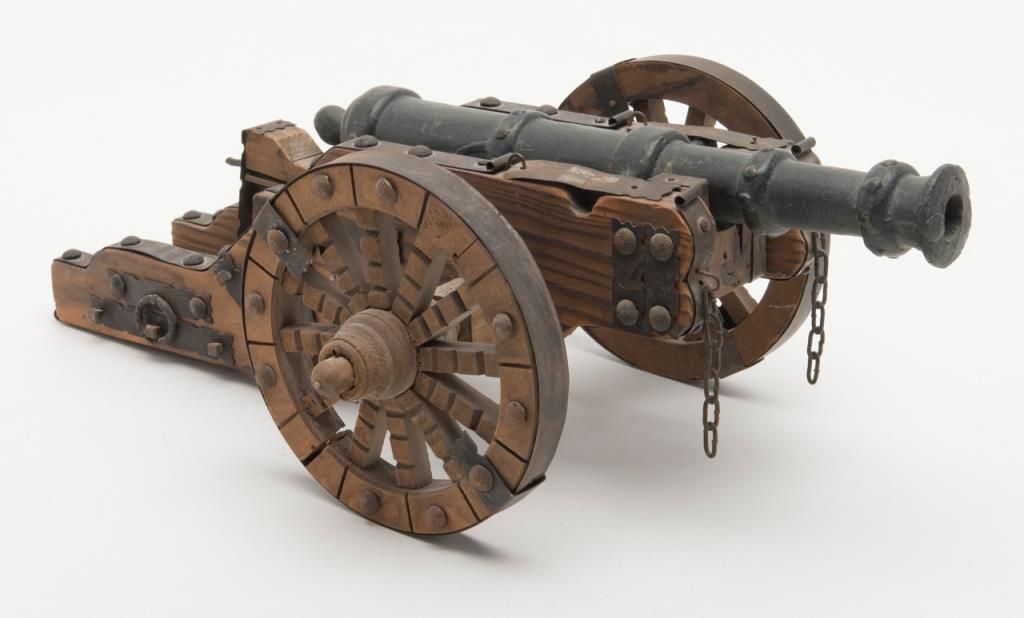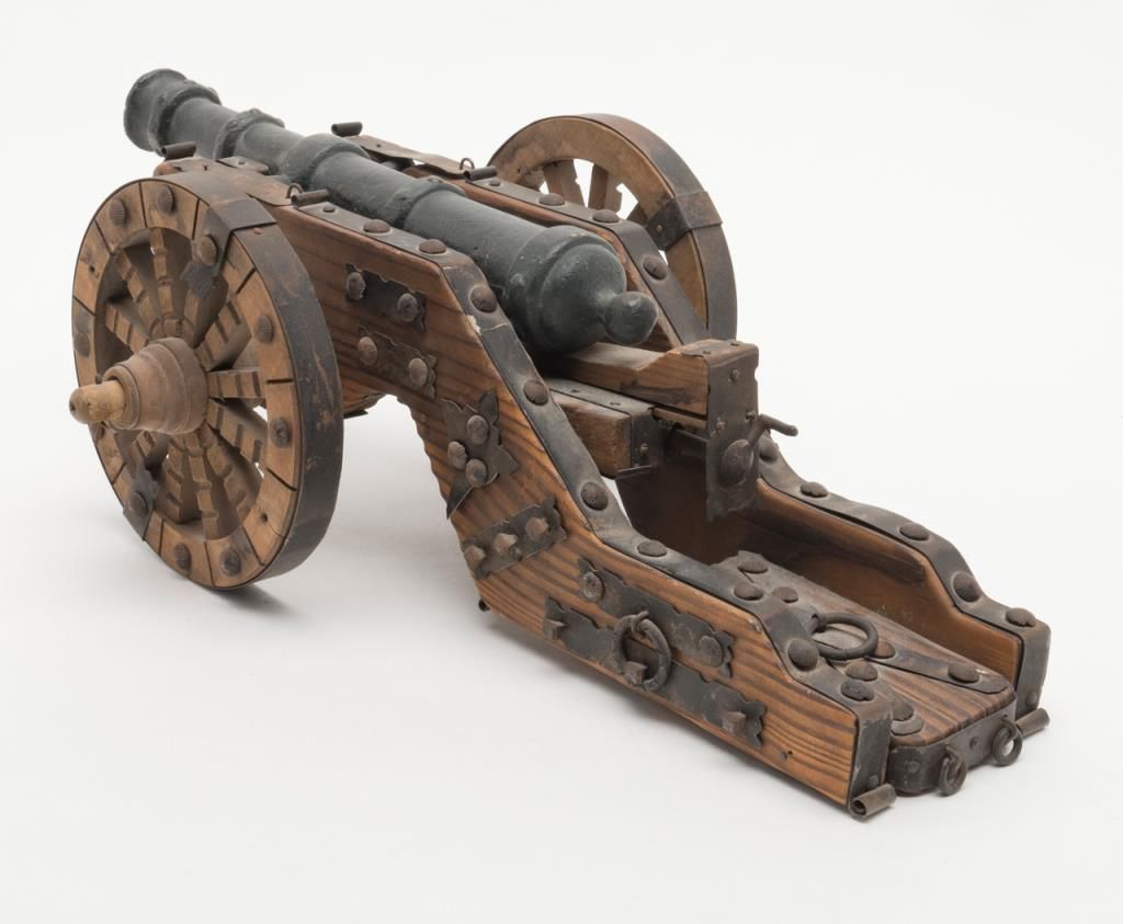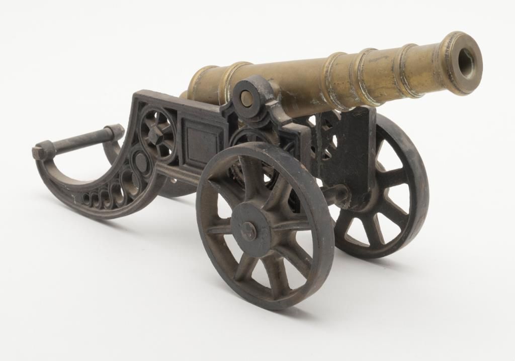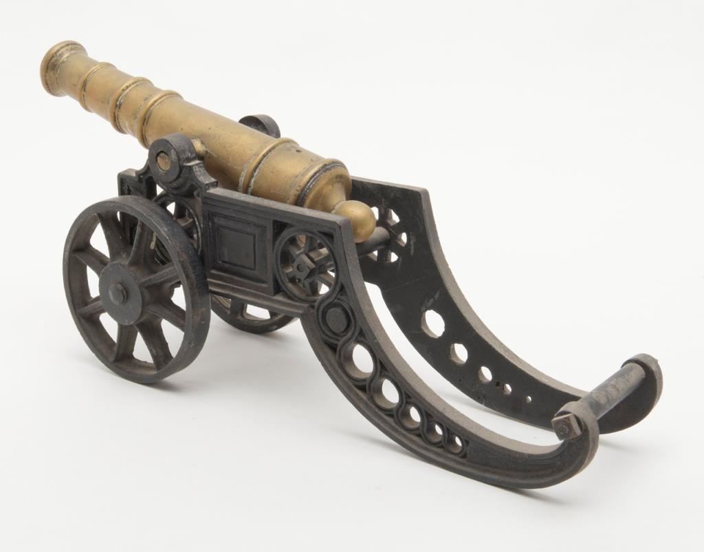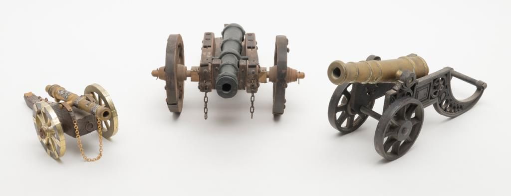 Lot of 3 miniature cannons including a brass cannon with iron carriage, approx. 18” long, 8” in height and 5-1/2” wide; a wood and cast cannon and carriage, approx. 14-1/2” long, 4-1/2” in height and 5” wide and a Spanish style iron cannon on wooden carriage, approx. 20” long, 9-1/2” wide and 7” tall. Est.: $150-$250.