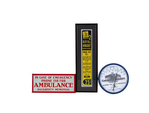 Lot of 3 misc items: Midwest Life (round thermometer) Royal Knight Prophylactics Ad (framed) Ambulance Sign