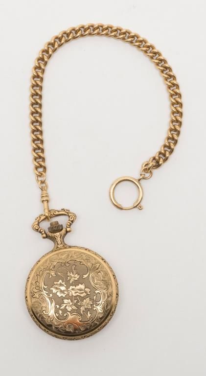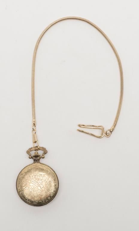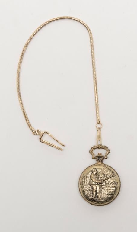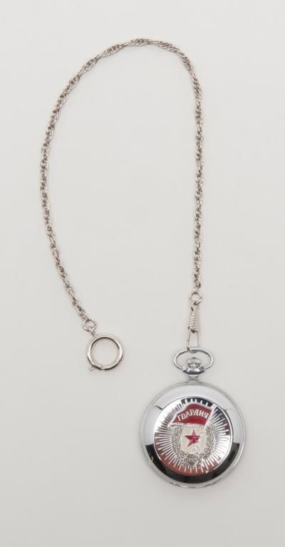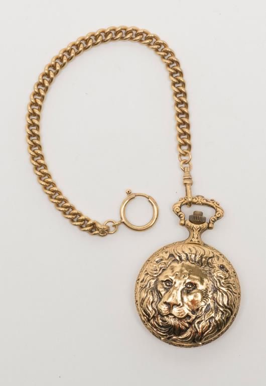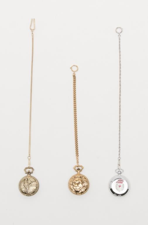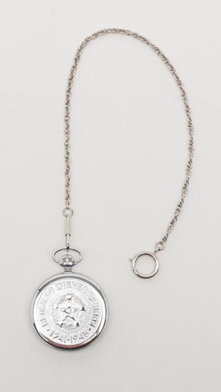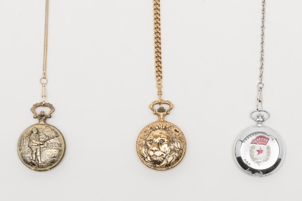 Lot of 3 modern Russian pocket watches with chains; one is nickel colored with red enamel and dates of 1941-1945 showing Soviet emblem; it is not working at time of description but appears externally like new and may be a battery operatedtype (we do not know); another is gold colored with a fisherman in relief; this watch is marked on the face “Quartz” and is not working but may not have a fresh battery as it appears in like new condition externally; the third is also goldcolored with a lion’s head in relief and the face of the watch showing “Jean Pierre” and “17 Jewels Shock Protected”; this watch is working at time of description. Est.: $100-$175.