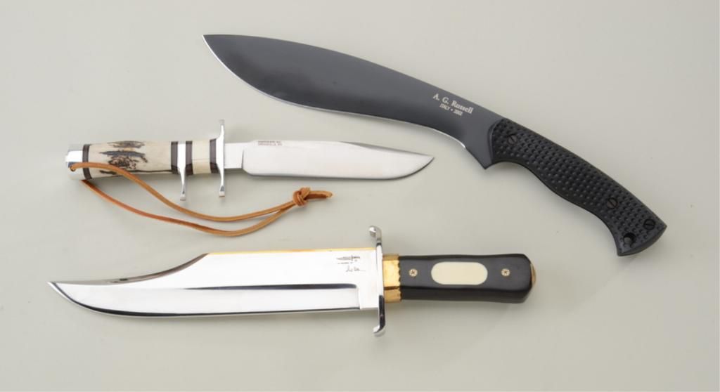 Lot of 3 modern knives including an A.G. Russell bolo style large knife with leather sheath in like new condition; a Blackjack Classic by Knifeware, Greenville, WV with leather sheath in like new condition withdouble cross guard and stag grip and a massive clip point modern bowie knife by Gil Hibben of La Grange, KY with inlaid wood grip, brass accented rib and leather sheath in like new condition approx. 15-1/2” overall with an approx. 10-12” blade. Est.: $500-$700.