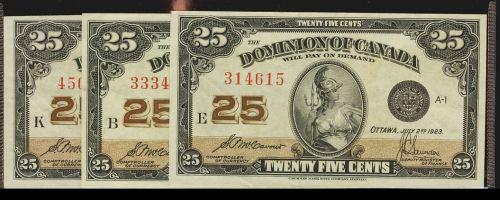 Lot of 3 notes, DC-24c 25 cents "McCavours" 3 different check letters; K,B,E. All AU to UNC