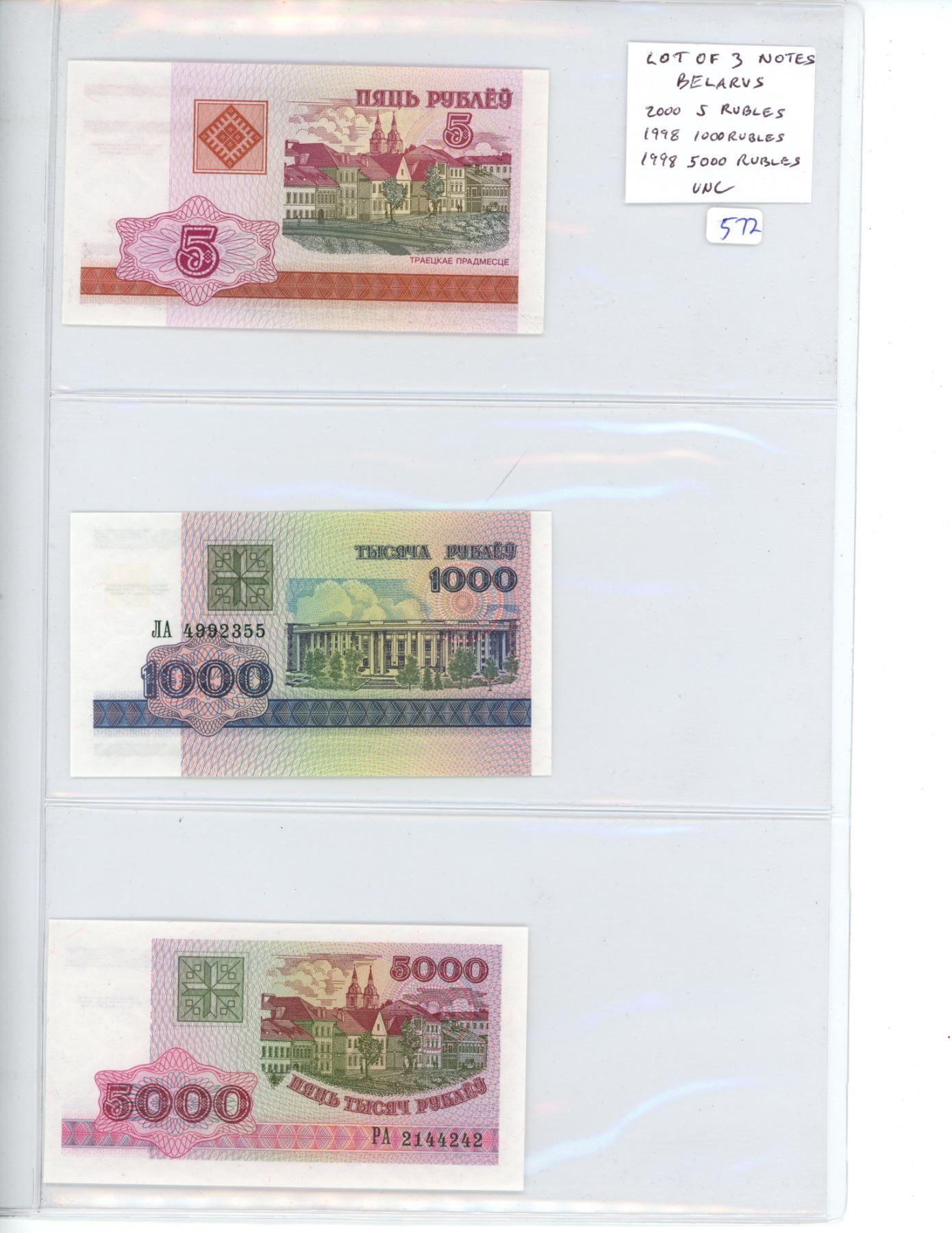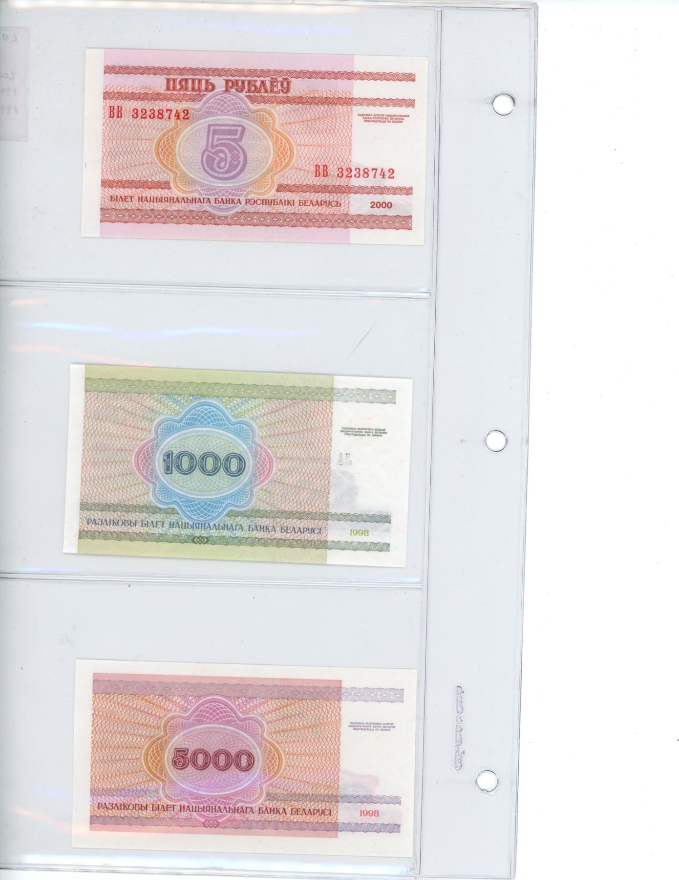 Lot of 3 notes from Belarus. 2000 5 rubles, 1998 1000 rubles and 1998 5000 rubles. Unc.