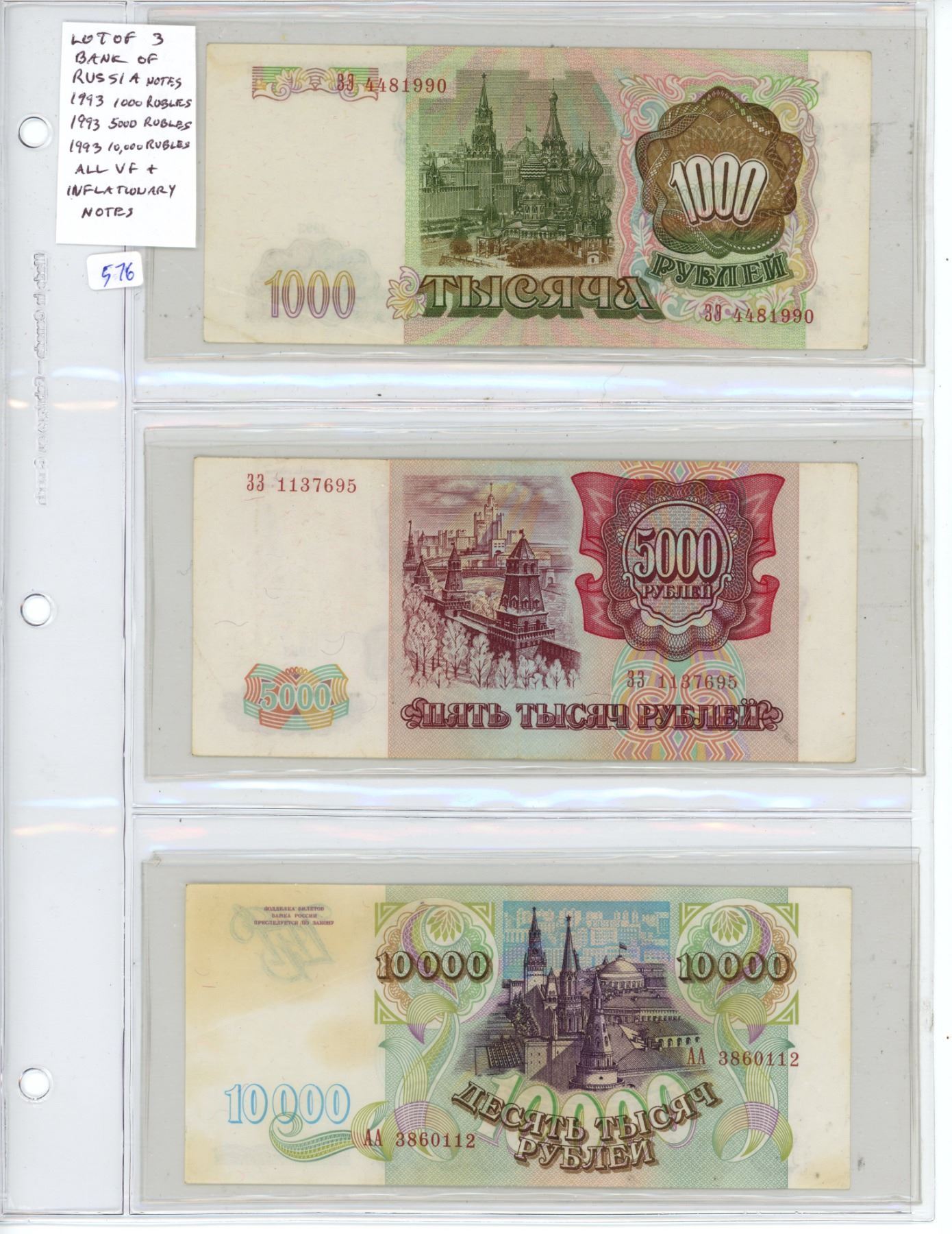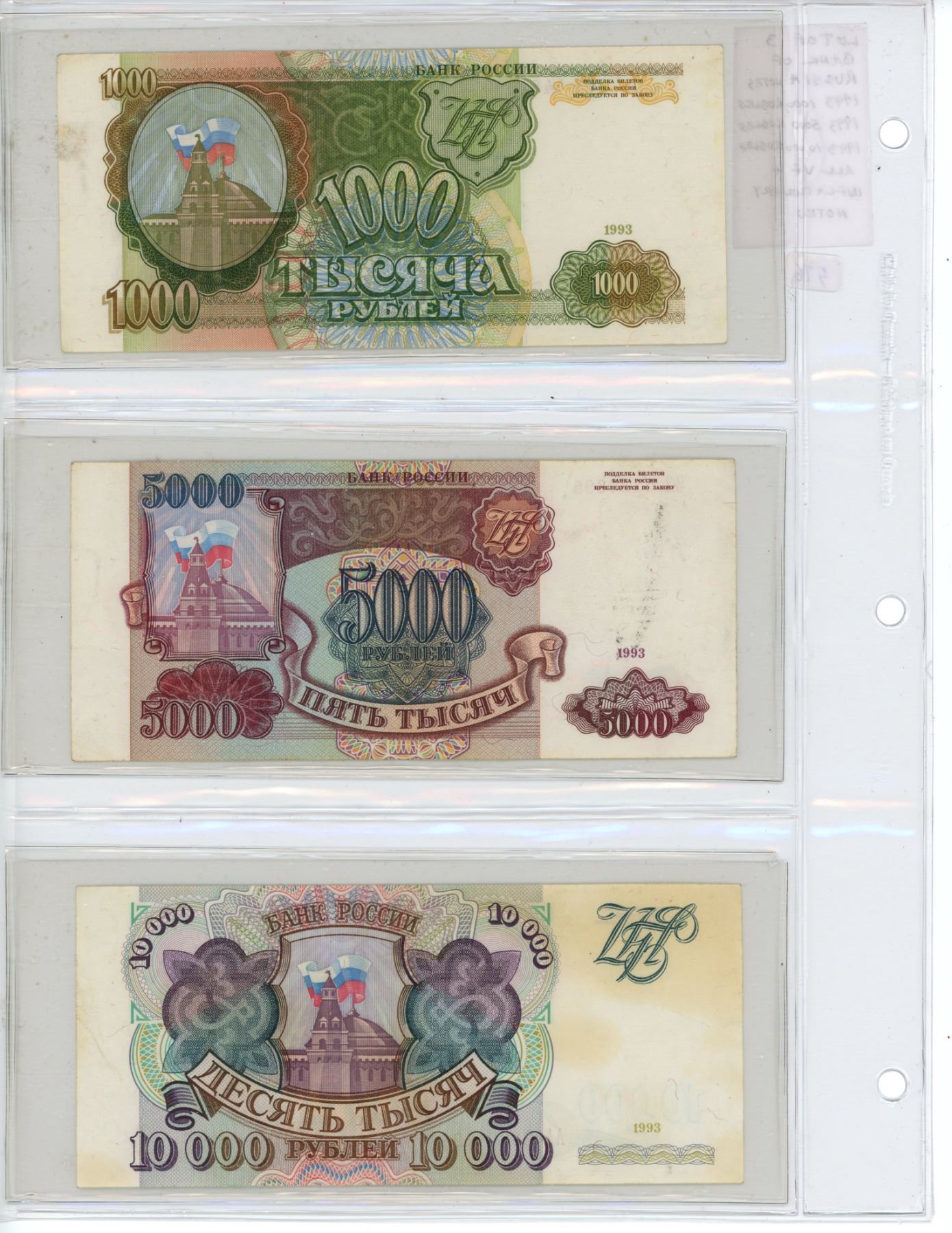 Lot of 3 notes from the Bank of Russia. 1993 1000 rubles, 1993 5000 rubles & 1993 10,000 rubles. All VF+ Inflationary Notes.