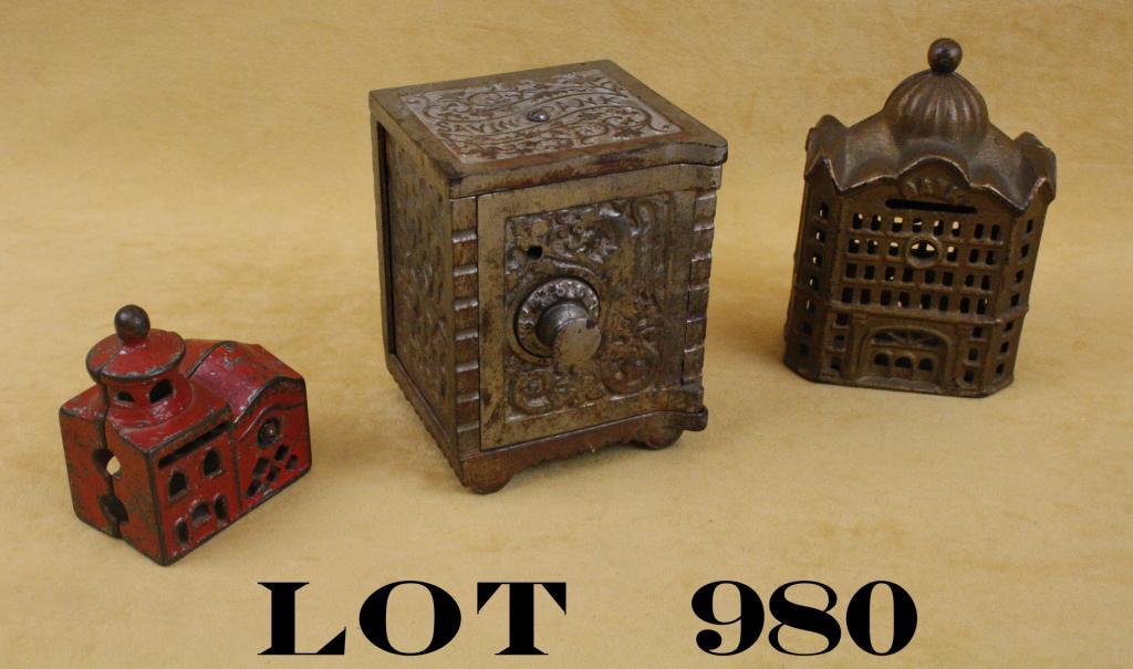 Lot of 3 old metal banks including a safe style “Saving Bank” approx. 4” x 3” x 3-1/2” marked “Kenton Brand” on the base and in overall fair to good condition; a building style bank approx. 5” x 3” x 2” withconsiderable original gold paint remaining and in overall good condition, and a small church style bank approx. 3” x 2-1/2” x 1-1/2” and showing considerable original red paint and also in overall good condition.Est.: $150-$300.