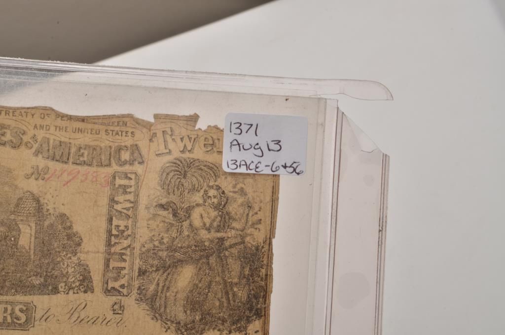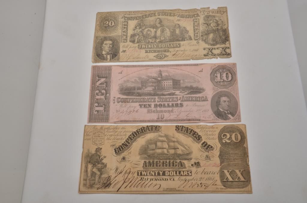 Lot of 3 pieces of Confederate currency; 2 - $20 bills and 1- $10 bill. Est.: $125-$250.