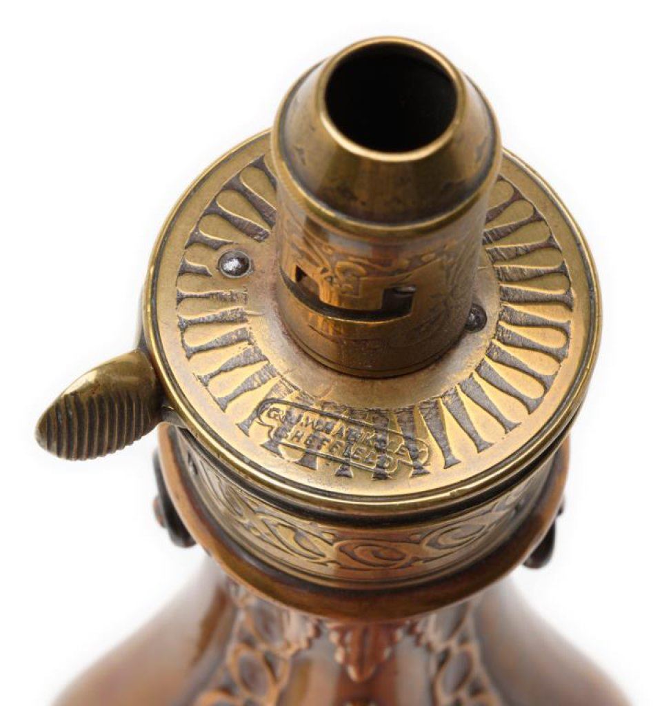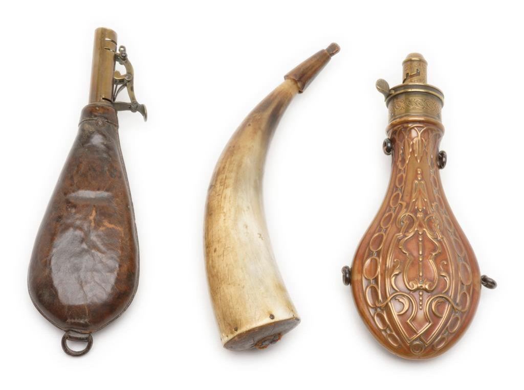 Lot of 3 powder flasks; one brass, one leather and a classic horn with wood plug. The brass flask is ornate and approx. 8” overall; the leather flask is approx. 8-1/2” overall with a graduated spout and the horn is approx. 9” in length. All are in overall very good condition. Est.: $75-$150.