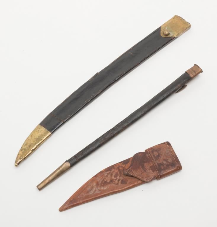 Lot of 3 scabbards; 1 for a French style Cutlass; 1 for a Mexican Bowie knife and 1 for an English bayonet. Est.: $50-$100.
