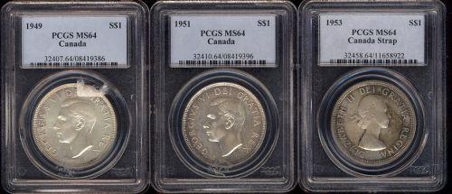 Lot of 3 silver dollars, all PCGS MS64. Includes 1949, 1951, 1953 SF. Some are nicely toned.