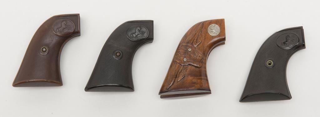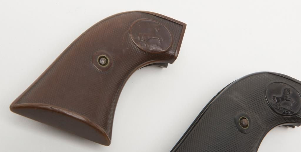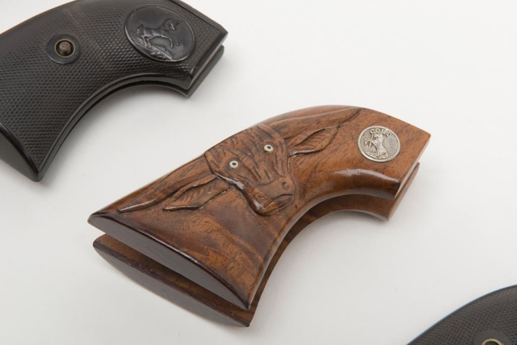 Lot of 3 single actions grips, one very good along with handmade steer head medallions. Est.: $250-$500.