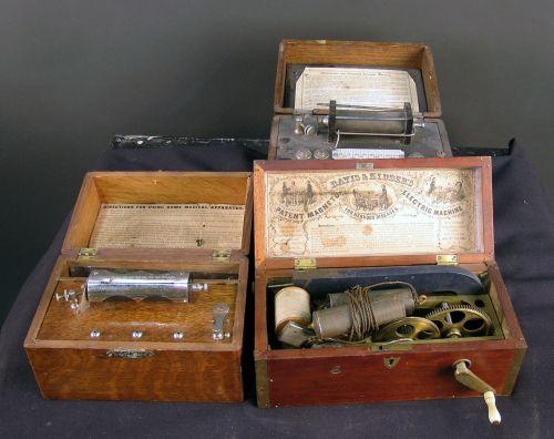 Lot of 3 small Shocking Machines; Dark wood box w/handle and 2 catches,Home Medical Apparatus w/filegree handle, Small wood box w/outside winding handle