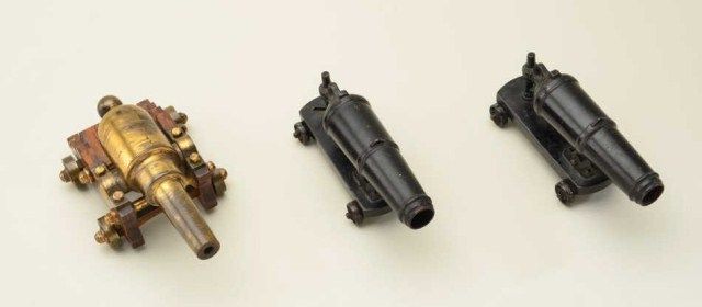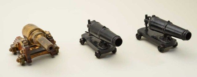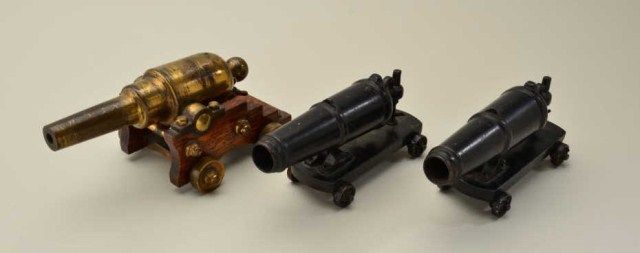 Lot of 3 small old metal display cannons including a pair of all metal cannons on metal carriages with rotating wheels approx. 8” long and 4” high, appearing to be circa the 1920’s to 1940’s and a brass cannon withbrass mountings on an oak carriage, approx. 9” long and 4” high and approx. the same estimated age; nicely accomplished and in overall very good condition. Est.: $175-$350.