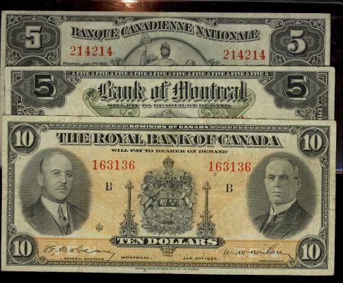 Lot of 3 small size chartered notes dated 1935. Includes $5 Banque Canadienne Nationale, $5 Bank of Montreal and a $10 from The Royal Bank of Canada.Grades vary from Fine to VF.