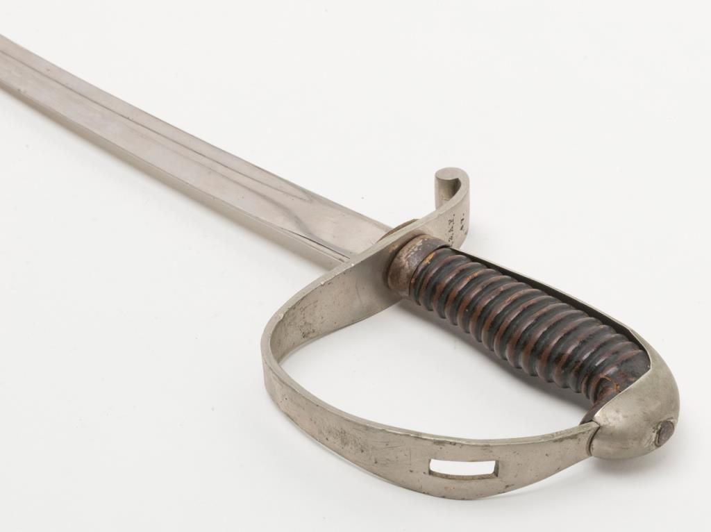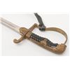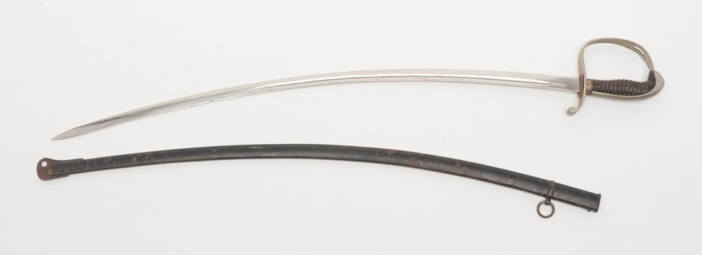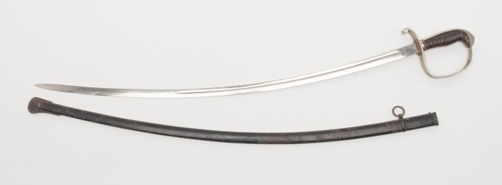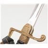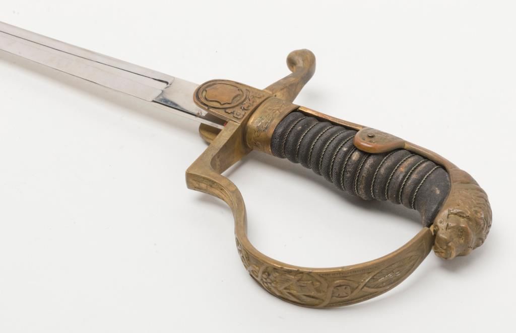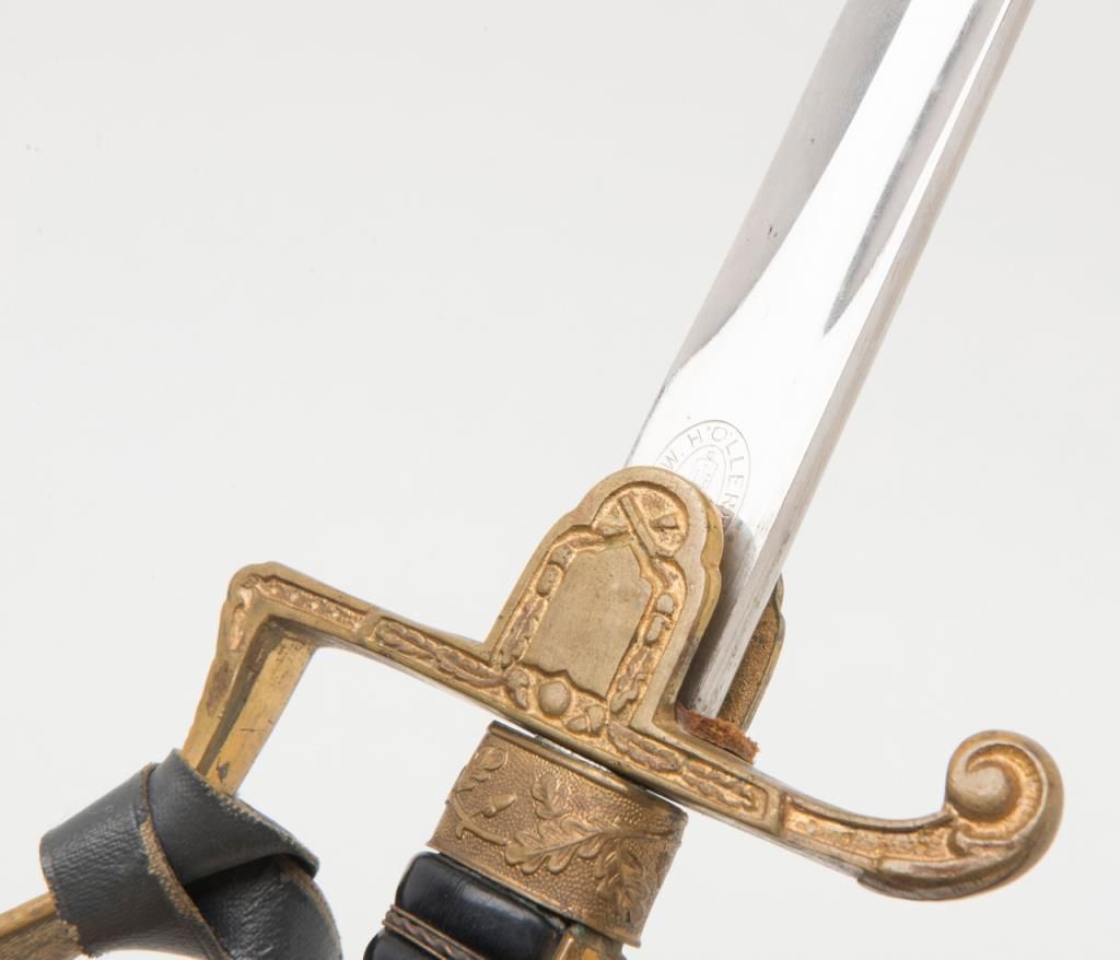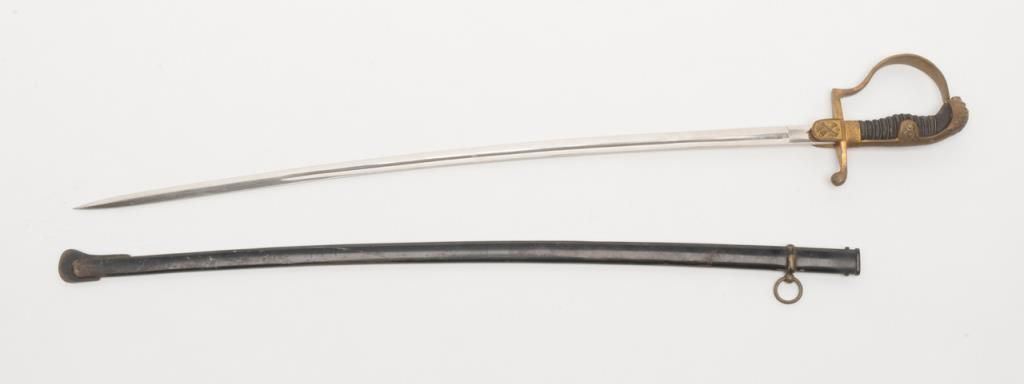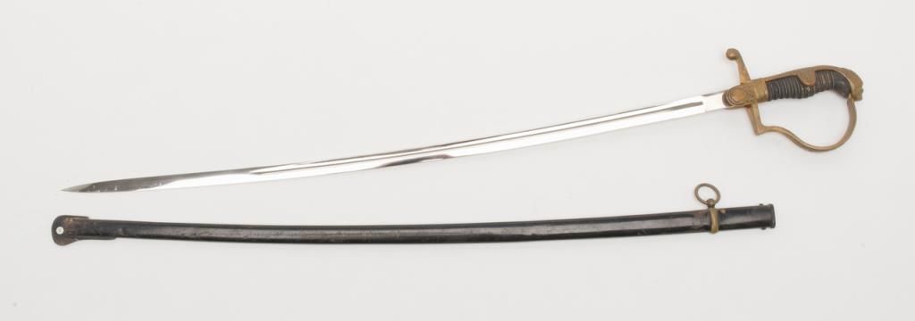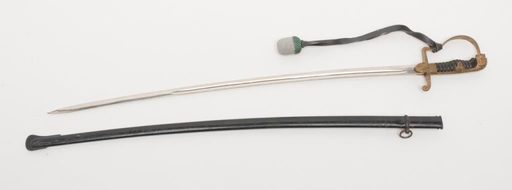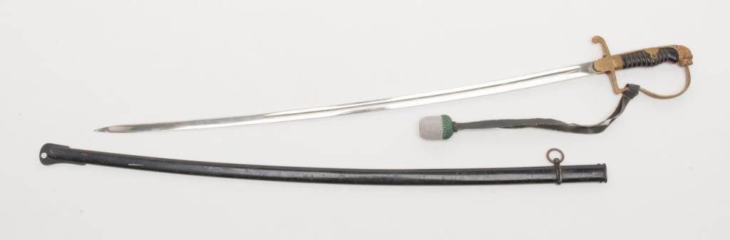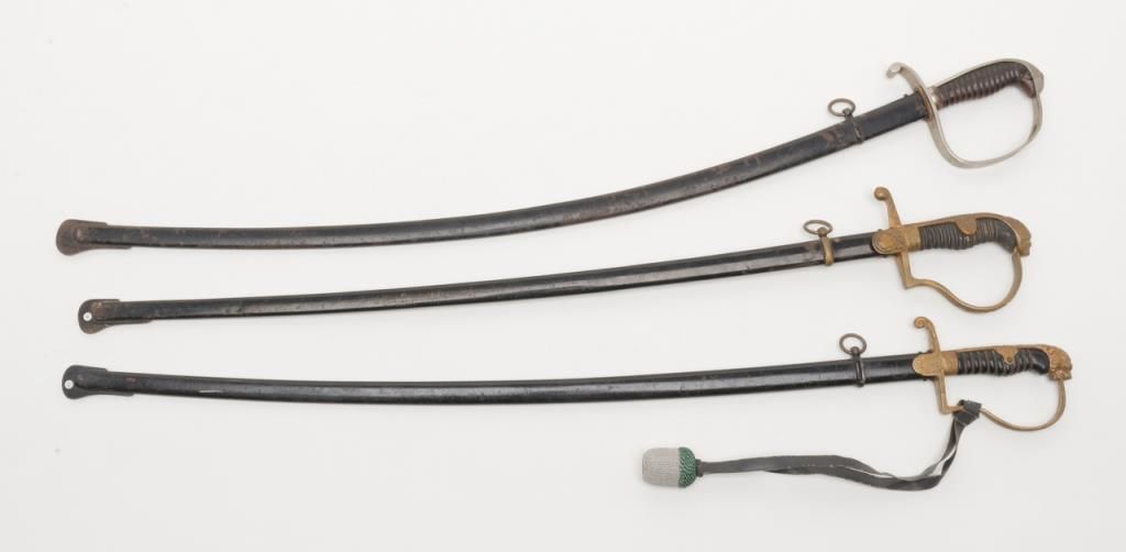 Lot of 3 swords, each with scabbard including an un-marked plain blade sword with brass guard with crossed cannons and lion head pommel, wire wrapped rayskin and metal scabbard approx. 37” overall and in very good condition; also an F.W. Holler,Solingen sword with plain blade, brass guard with spread eagle over swastika and lion’s head pommel, wire wrapped black grip with metal scabbard approx. 38-1/2” overall and in good condition with hanging knot; finally including a curved bladeun-marked sword, approx. 40” overall with wood grip, wire wrap missing, good blade, scabbard missing some of its black paint. Est.: $250-$500.