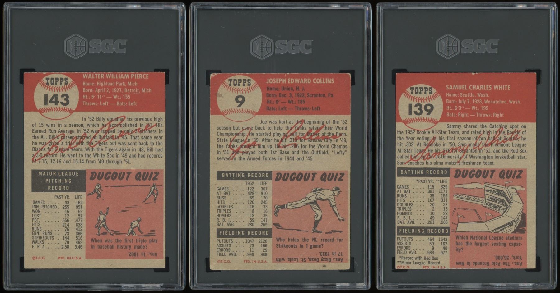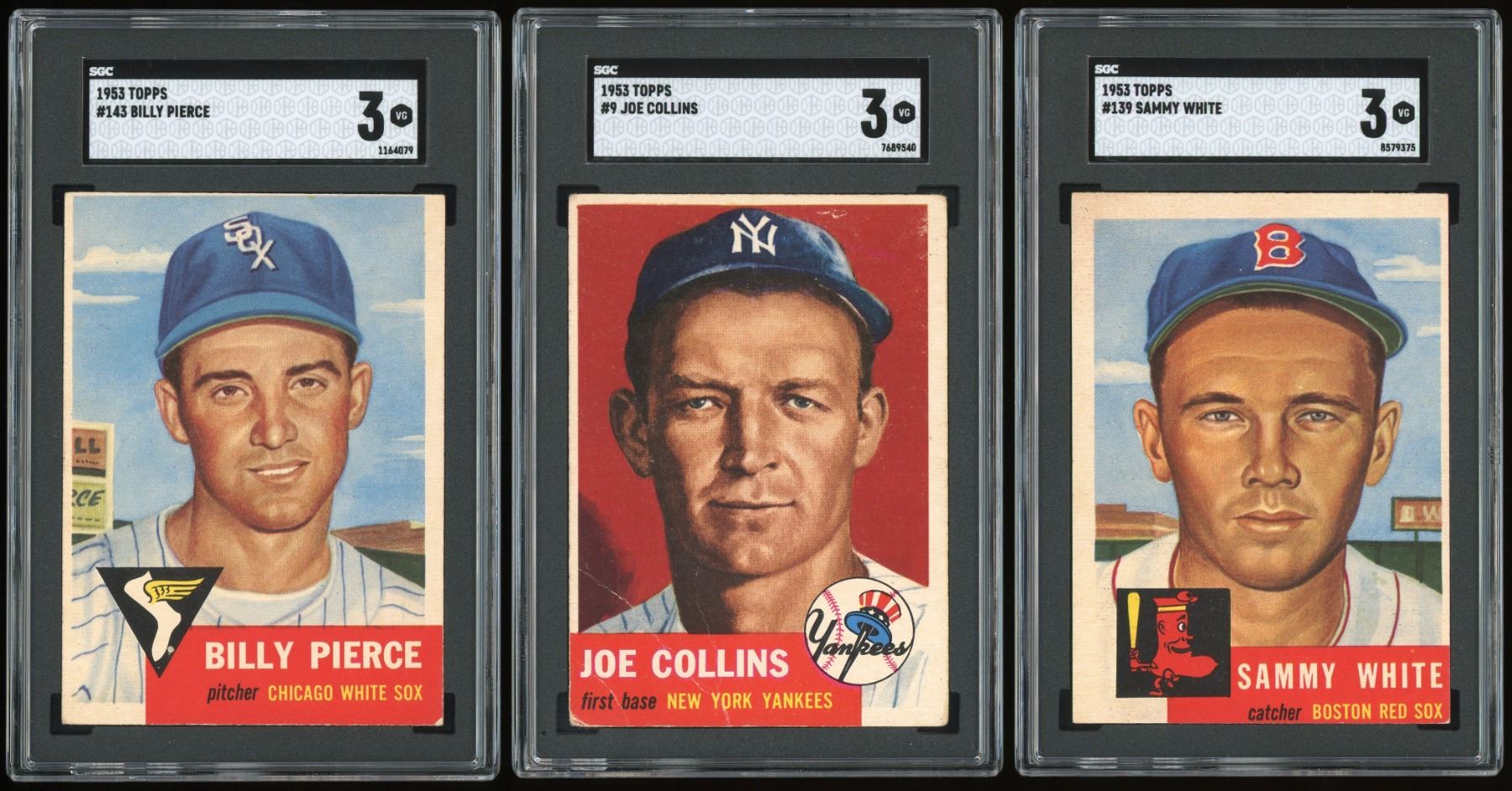 This lot contains three SGC-graded cards from the classic 1953 Topps baseball set. Includes #9 Joe Collins (3 VG), #139 Sammy White (3 VG) and #143 Billy Pierce (3 VG).