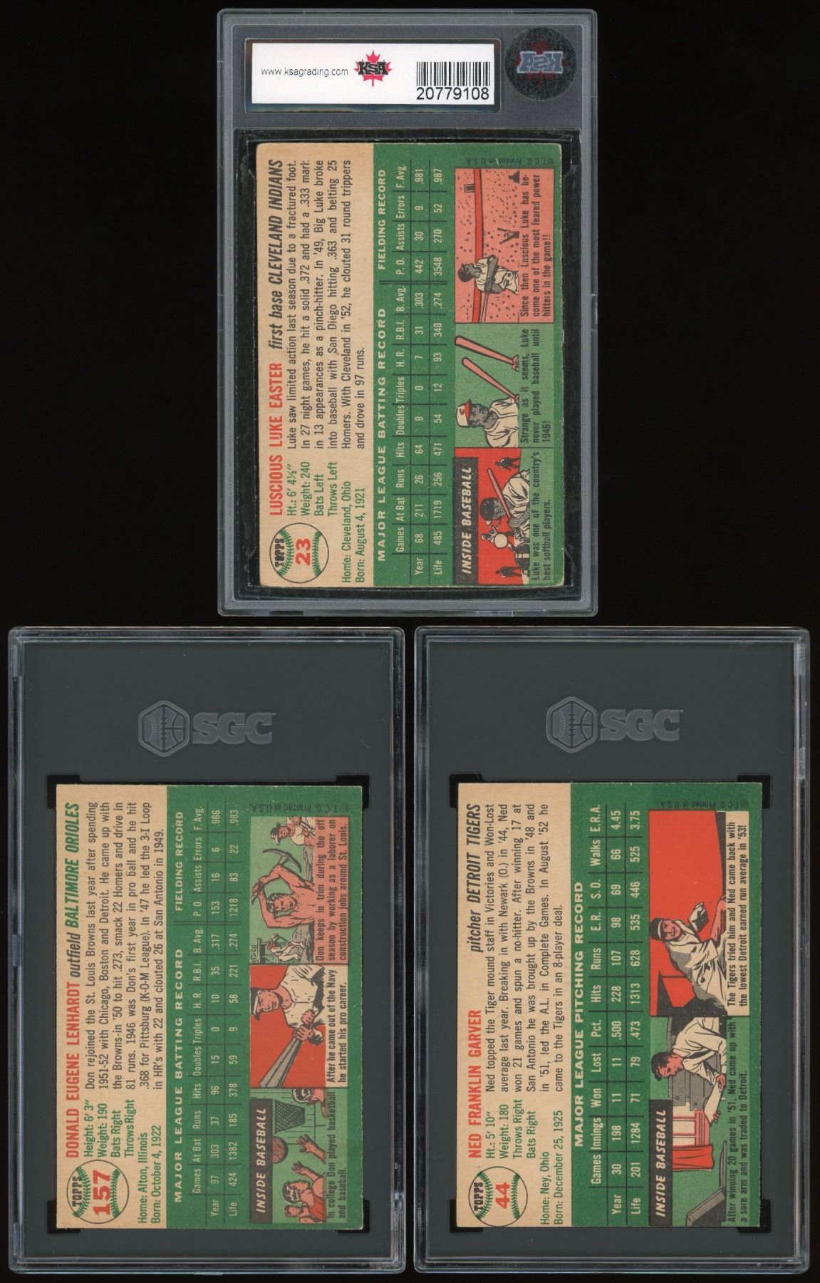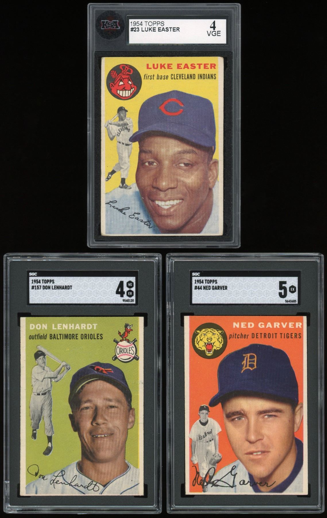This lot contains three graded cards from the classic 1954 Topps baseball set, includes star #23 Luke Easter (KSA 4 VG-EX), #44 Ned Garver (SGC 5 EX) and #157 Don Lenhardt (SGC 4 VG-EX).