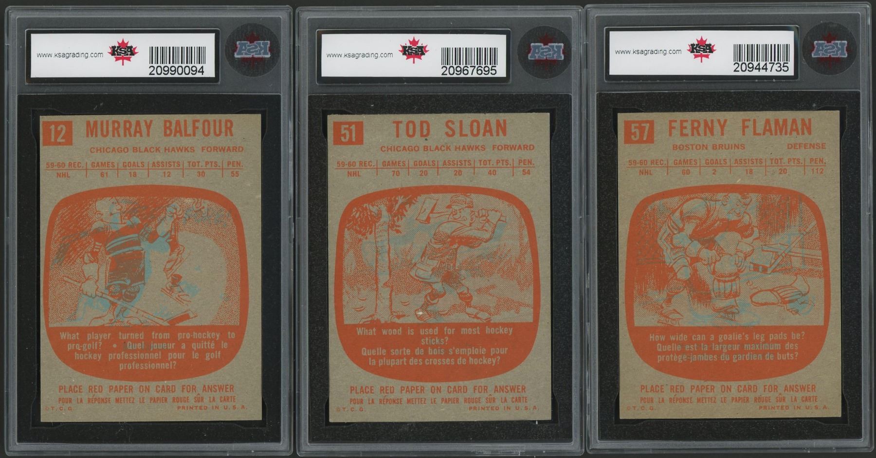This lot contains 3 x KSA graded hockey cards from the colorful 1960-61 Topps set, includes #12 Murray Balfour (KSA 7.5 NM+), #51 Tod Sloan (KSA 6 EX-NM) and #57 Fern Flaman (HOF) (KSA 6.5 EX-NM+).