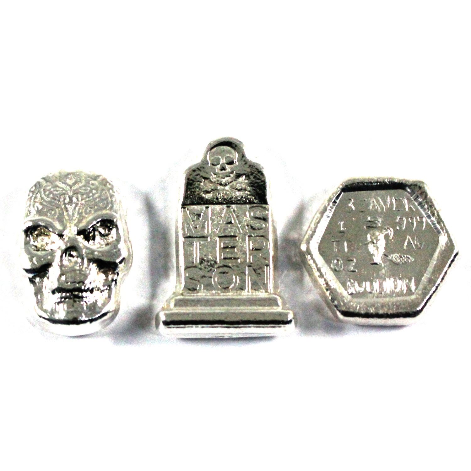 Lot of 3 x 1oz fine silver hand poured Beaver Bullion rounds. Lot includes a skull, Tombstone, & Hexagon Beaver. (Tax Exempt) 3pc
