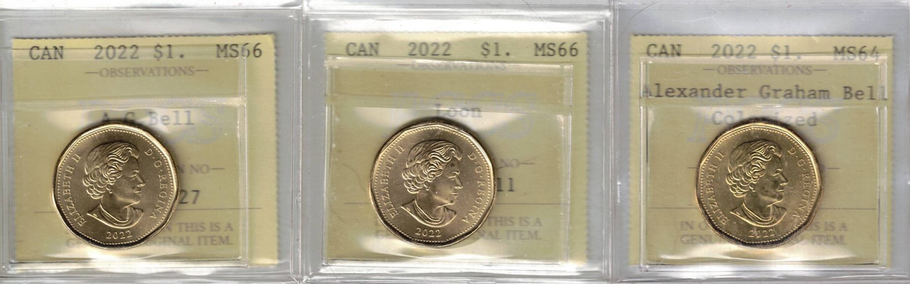 2022 $1 A.G.Bell Colorised MS64, 2022 $1 A.G.Bell MS66 and 2022 $1 Loon MS66 All PCCS (Professional Coin Certification System)