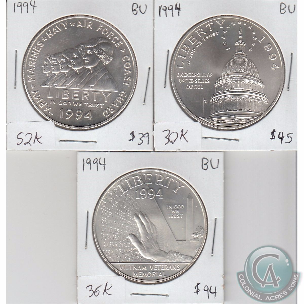 Lot of 3 x United States Commemorative Silver Dollars. Dated 1994, in Brilliant Uncirculated Condition. 3 pcs