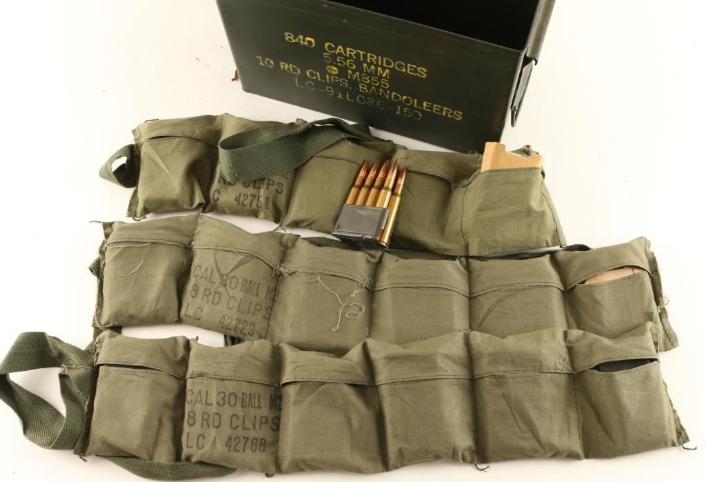 Includes 3 loaded bandeliers, each holding 6-8 rd clips and an ammo can.