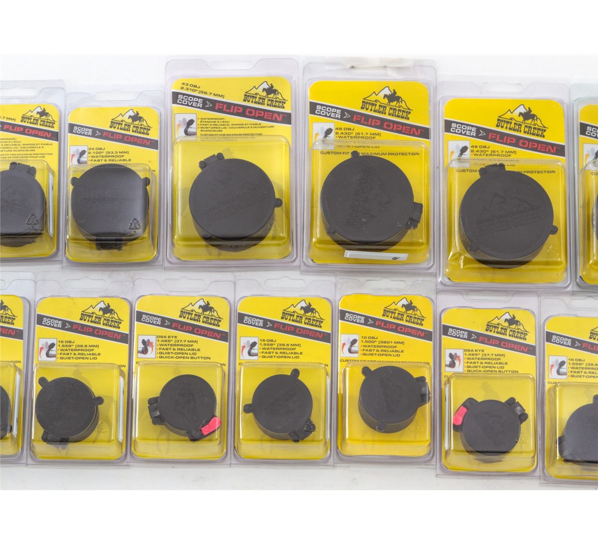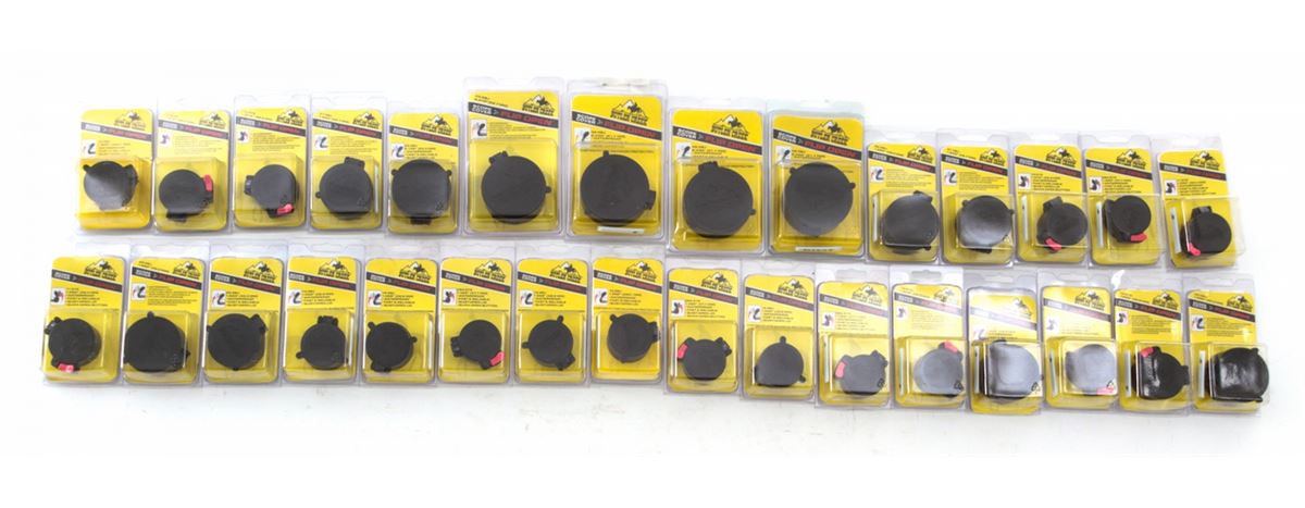 Dealer's Lot of Thirty (30) Butler Creek Flip-Open Scope Covers, for 1.890'' (48mm); 1.516'' (38.5mm); 1.820'' (46.2mm); 1.558'' (39.6mm); 1.485'' (37.7mm); 2.310'' (58.7mm); 1.605'' (40.8mm); 2.430'' (61.7mm), etc. All brand new in original packaging. Retails @ $300/lot. Est.: $150-$250/lot. (Field Time)