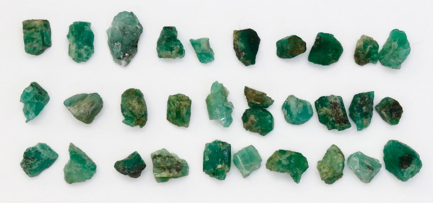 Lot of 30 natural emeralds, less than 1 carat each. About 1/4" each. Very large assemblage of olive-green stones, some dark, some light, and the rest in between, all opaque with black or white encrustation, useful size for mounting. From the Maravillas (1656), with photo-certificates #CE0105, 107, 133, 140, 145, 149, 152, 155, 161, 167-8, 170, 172, 182-4, 189, 192, 203, 208-9, 213, 217, 223, 230-1, 239, 244 and 246-7.
