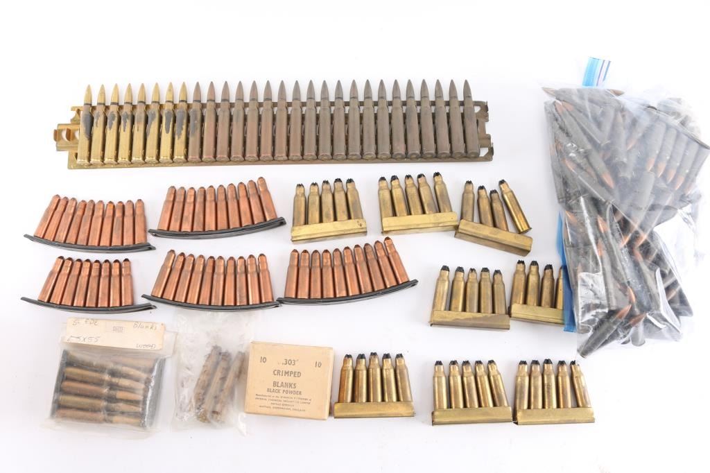 Approx. 270 rounds total. Approx. 122 ammunition blanks, some .303 British, 6.5 X 55mm & others. Possibly Chinese 7.62 X 39mm, most on stripper clips. Approx. 28 rounds of 7.7mm Nambu ammunition on stripper clip for Type 92 machine gun. Comes with partial tropical/jungle storage sleeve & approx. 120 rounds of 7.62 X 45mm military surplus factory new ammunition. All loose in zip lock bag.