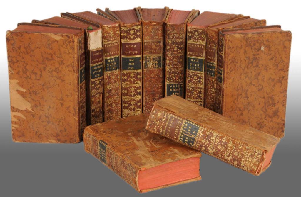 Description Original first print of Journal Politiq, dated 1785 - 1792. Written in French and printed in raised black ink. Includes offset print raised ink drawings and sketches. Bound in custom leather with gold print binding cover. Condition (Very Good - Excellent).