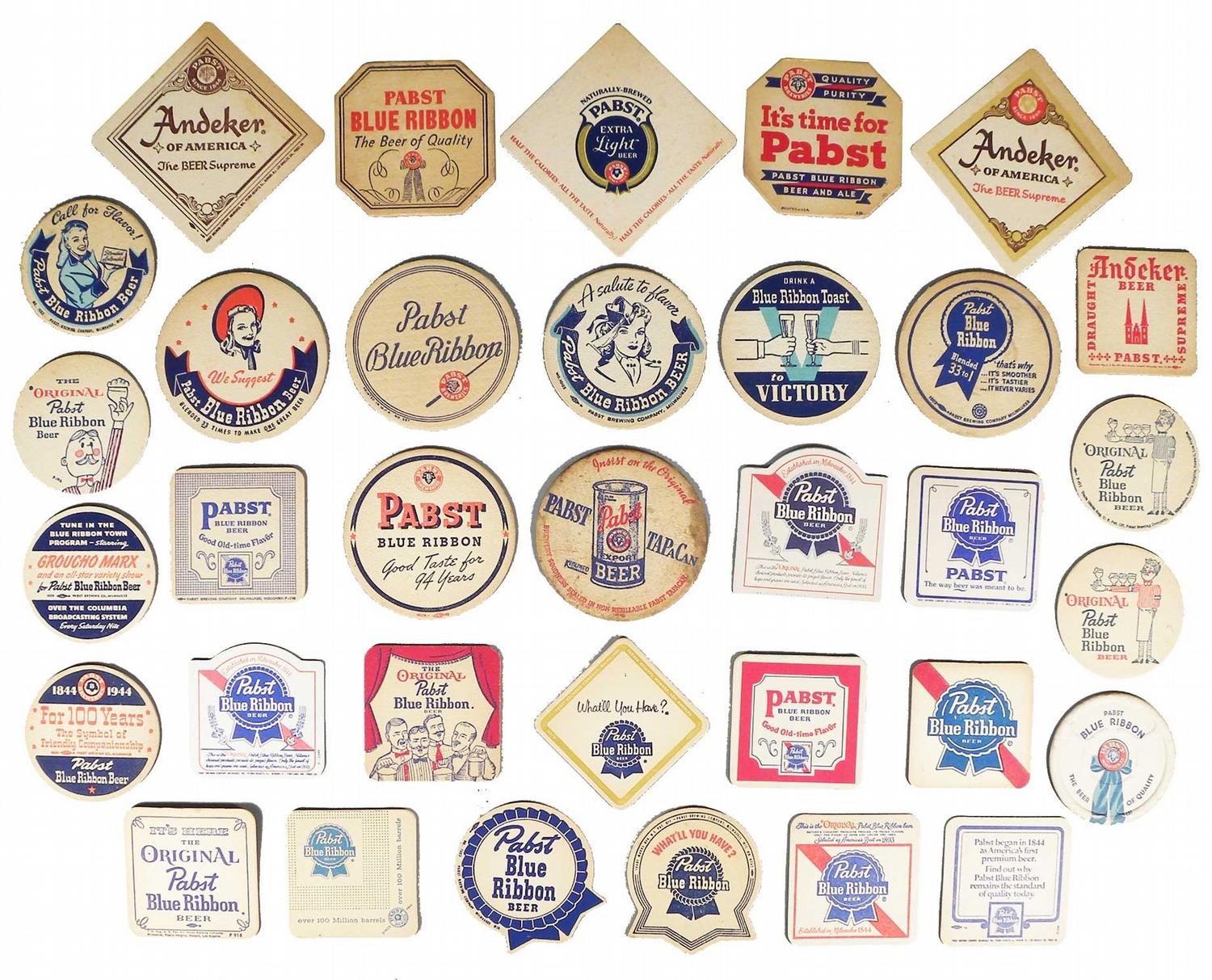 Lot of 34 Assorted Pabst Blue Ribbon Coasters. Good to excellent condition.