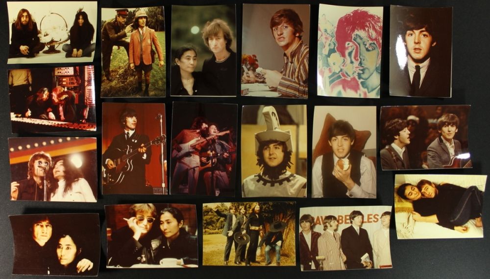 Lot includes 34 photos, most of which are 5x7" in size. One photo is 4x6.5". Photos show John Lennon, Yoko Ono, Paul McCartney, George Harrison and Ringo Starr. Some of the photos have "Silver Screen Prod, Inc. 1979" stamped on the back.